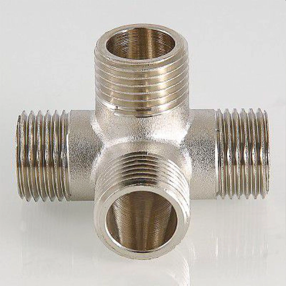 Латунный резьбовой фитинг - двухплоскостная крестовина. Разработан для применения в квартирных водопроводных узлах. Крестовина заменяет собой коллектор на три выхода, значительно сокращая монтажные га-бариты узла.