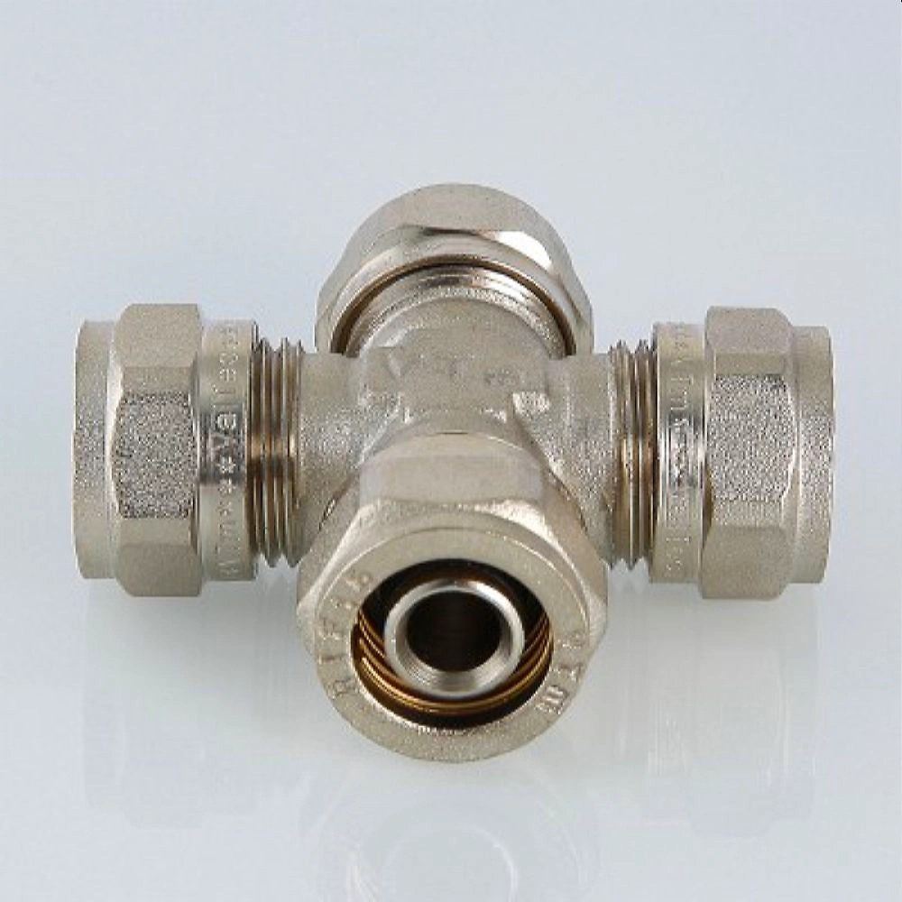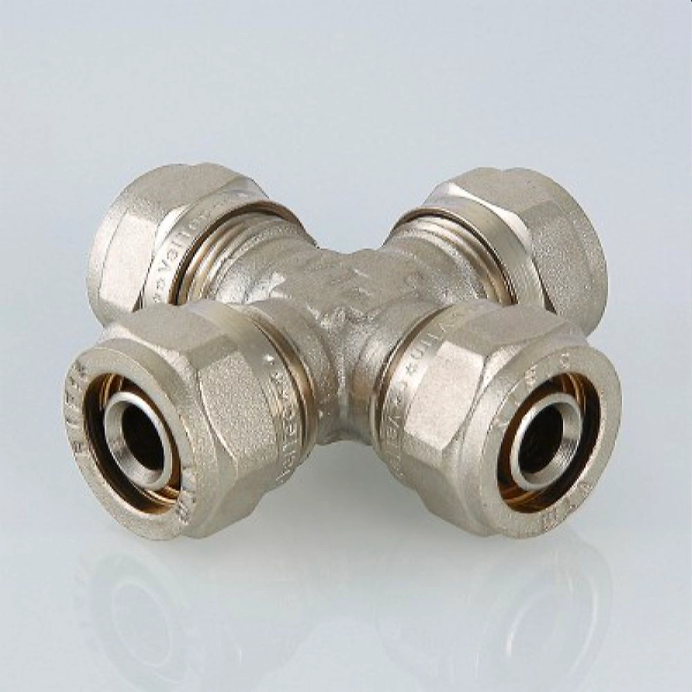 Латунный никелированный фитинг для соединения четырех металлополимерных труб (крестовина). Имеются равнопроходные модели и модели с разными диаметрами "пересекающихся" трубопроводов. Cерия VTm.341.N