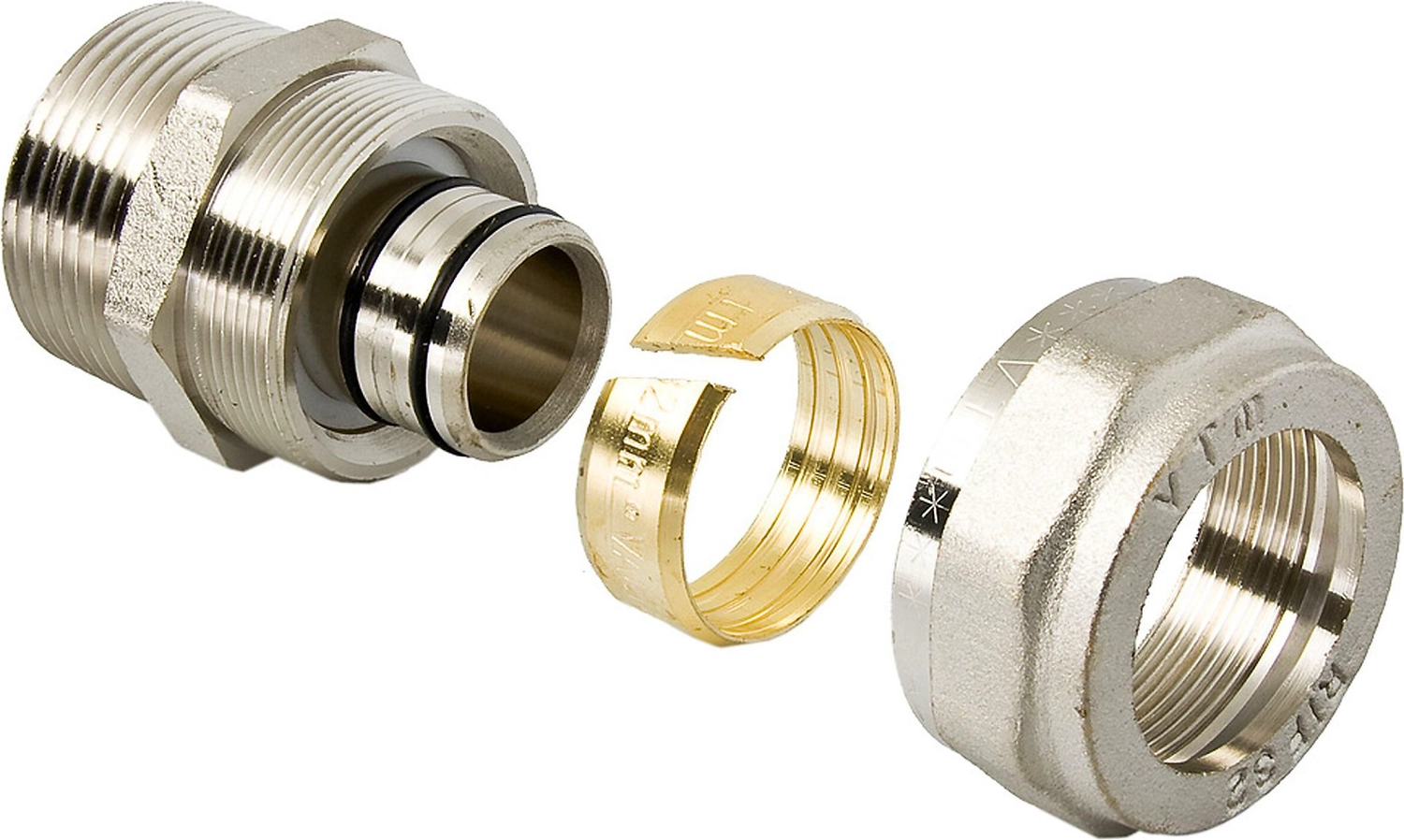 Двухсторонний прямой латунный никелированный фитинг для соединения металлополимерной трубы и компонента системы с резьбовым подключением.