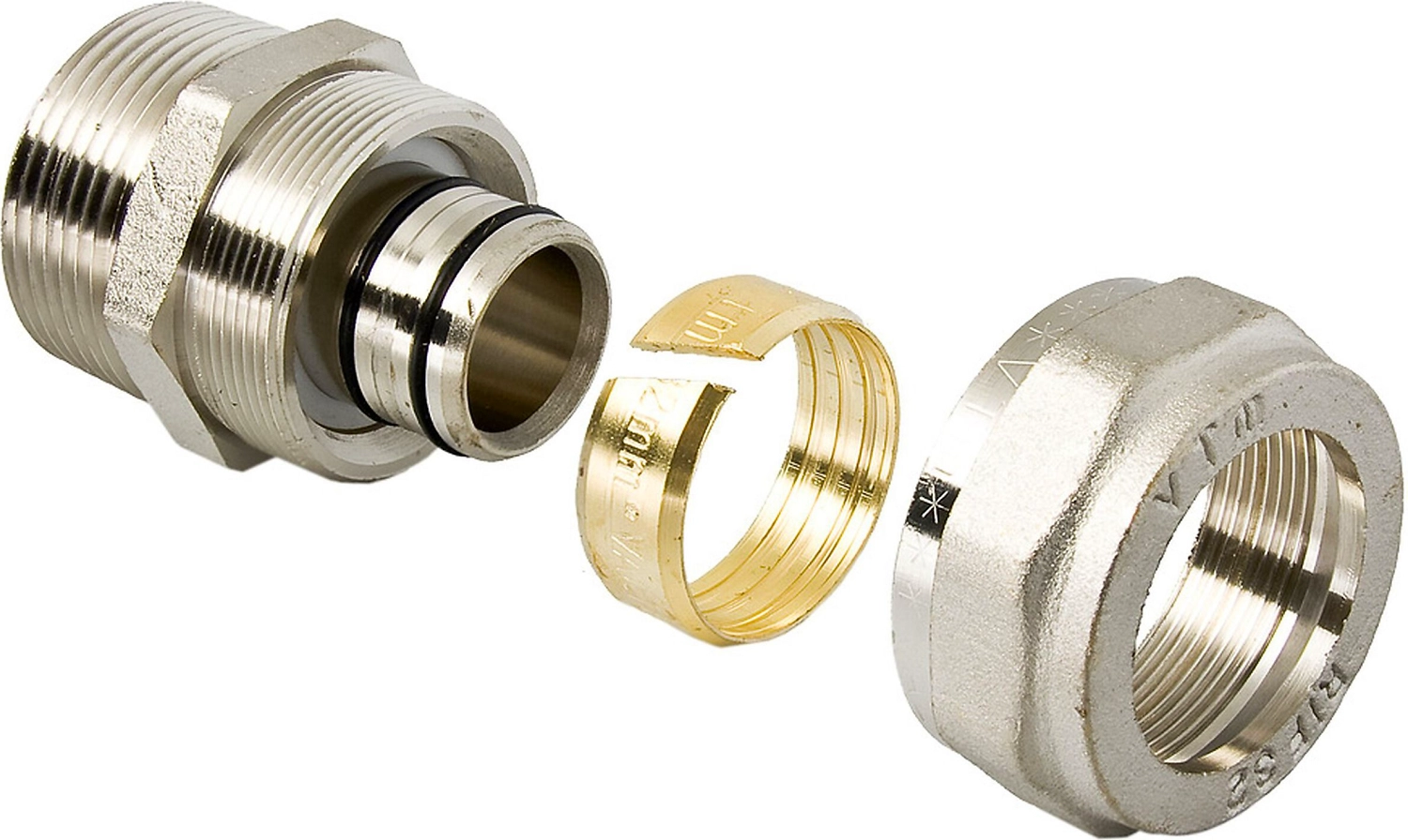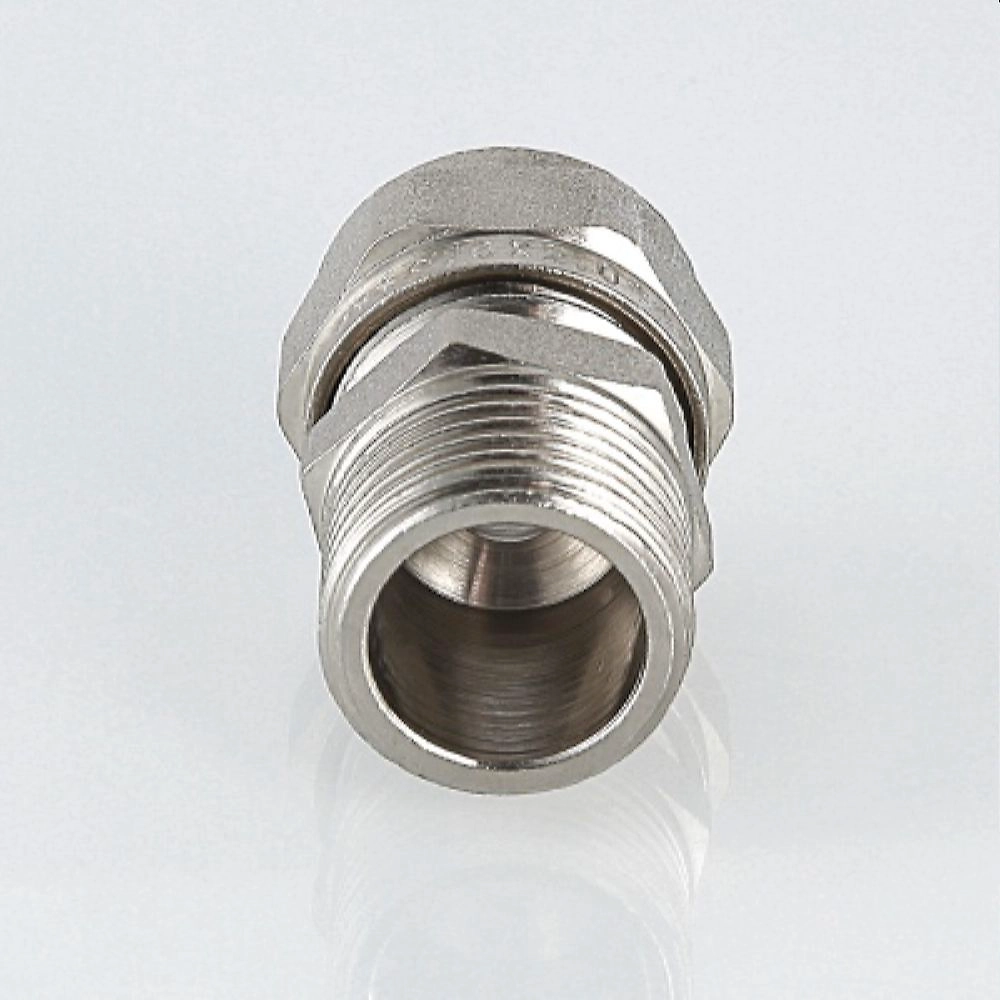 Двухсторонний прямой латунный никелированный фитинг для соединения металлополимерной трубы и компонента системы с резьбовым подключением. Резьба фитинга - наружная трубная по ГОСТу 6357, 16 х 3/4".