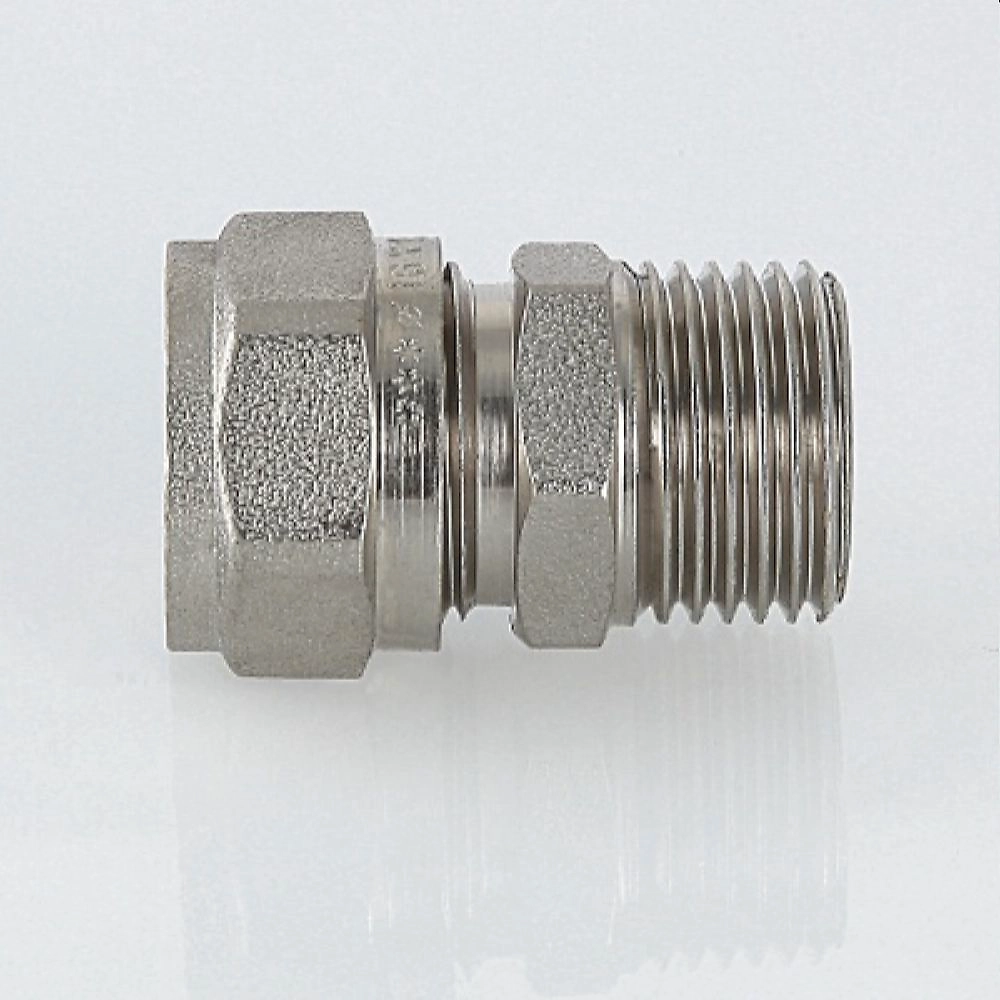Двухсторонний прямой латунный никелированный фитинг для соединения металлополимерной трубы и компонента системы с резьбовым подключением.