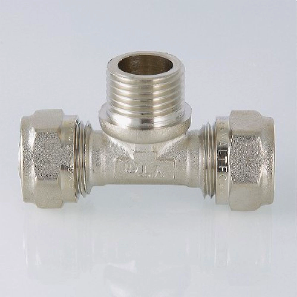 Трехсторонний латунный никелированный фитинг для подсоединения к металлопластиковому трубопроводу компонента с резьбовым подключением. Резьба фитинга - наружная трубная, 26 х 1", по ГОСТу 6357. Cерия VTm.333.N.