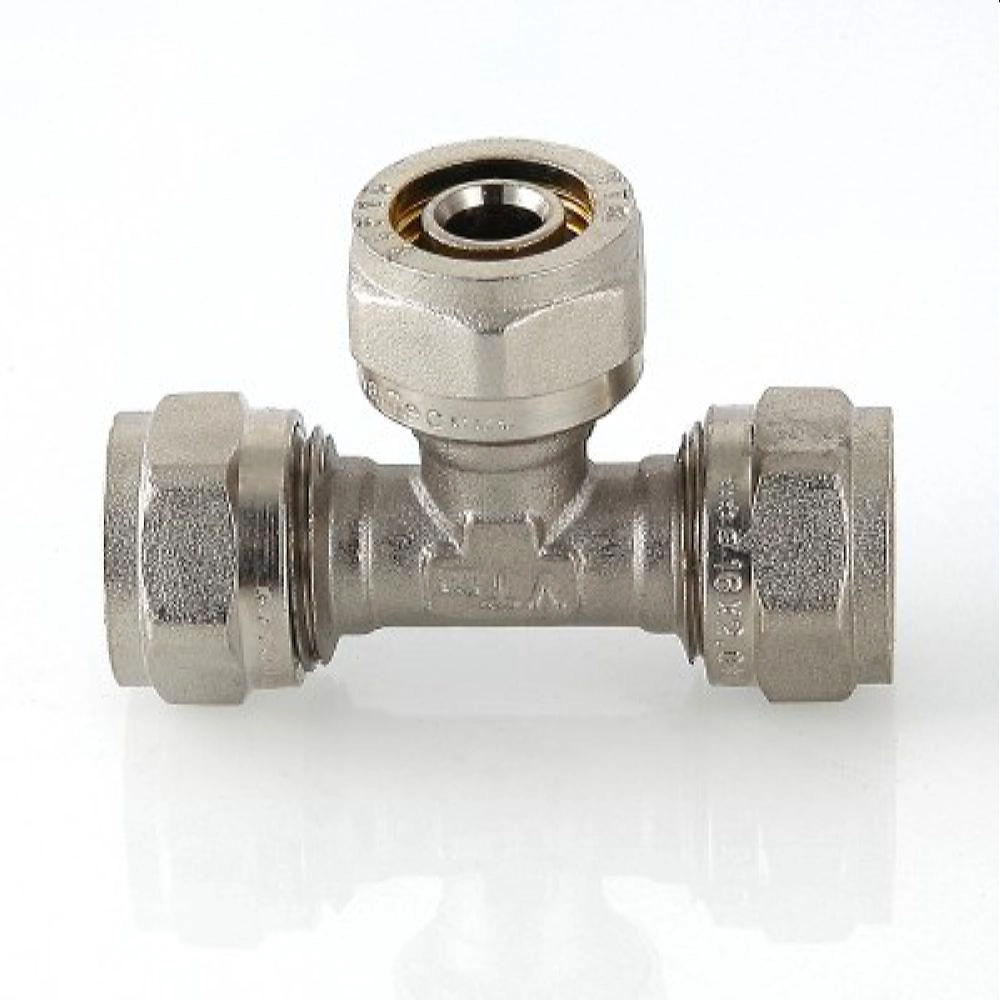 Обжимной фитинг латунный никелированный для соединения трех металлополимерных труб (тройник), 16. Имеются равнопроходные и переходные модели. Cерия VTm.331.N