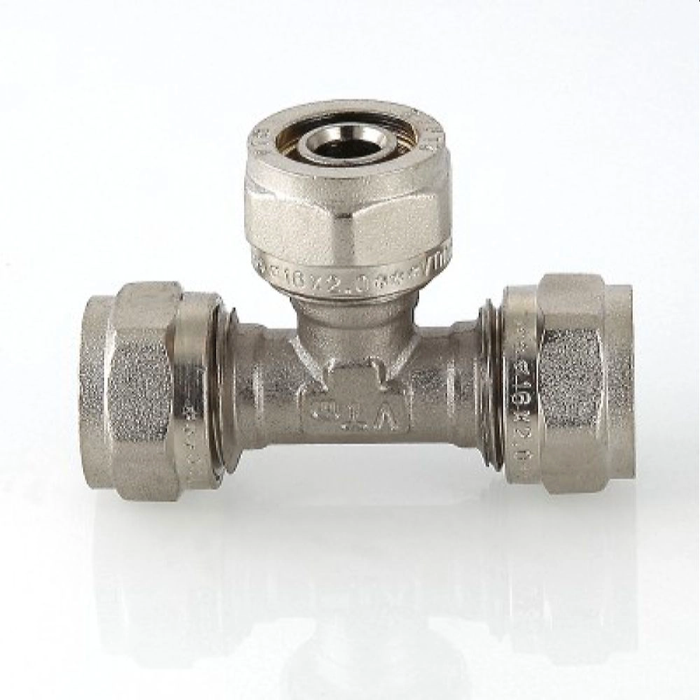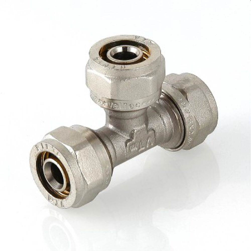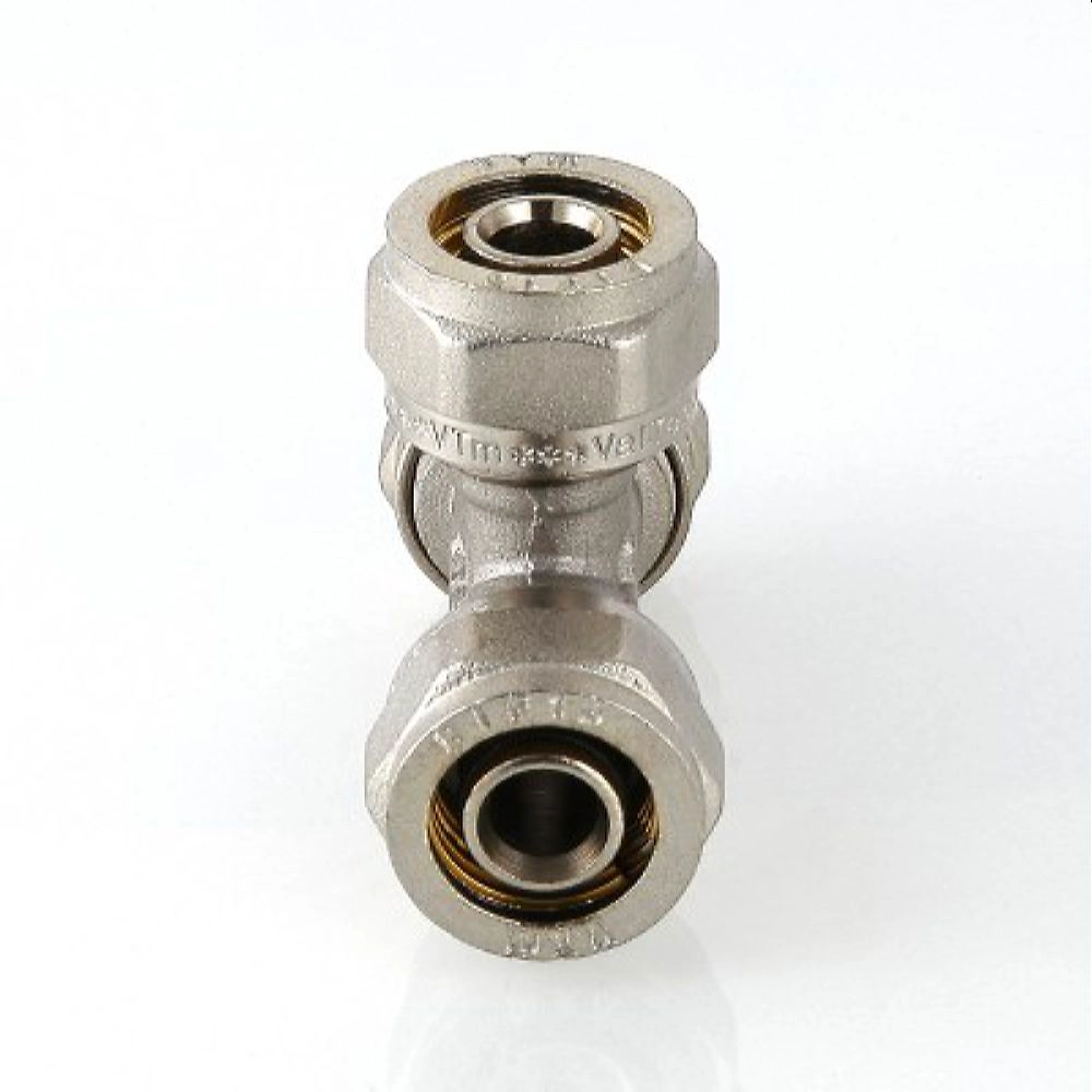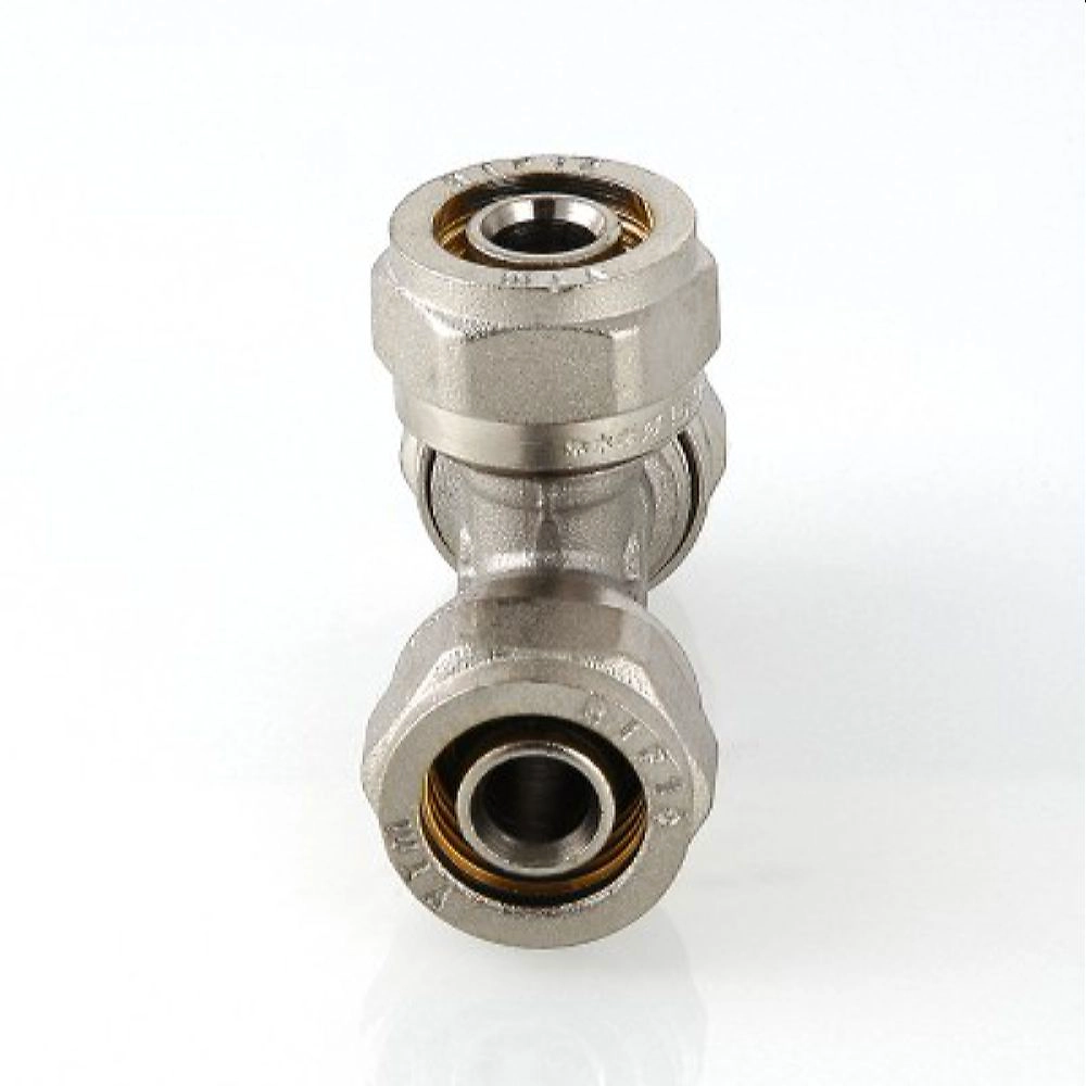 Латунный никелированный обжимной фитинг для соединения трех металлополимерных труб (тройник). 20 х 20 х 16.