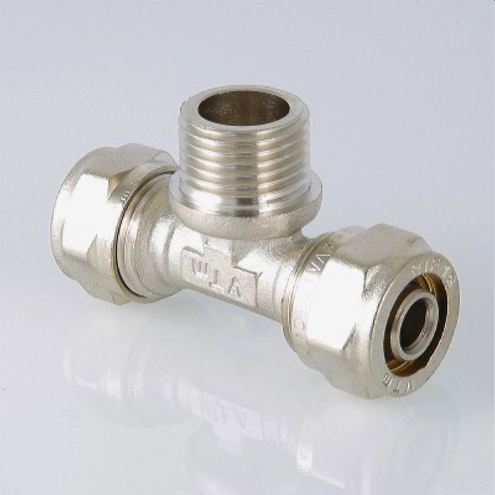 Трехсторонний латунный никелированный фитинг для подсоединения к металлопластиковому трубопроводу компонента с резьбовым подключением. Резьба фитинга - наружная трубная по ГОСТу 6357, 26 х 3/4"