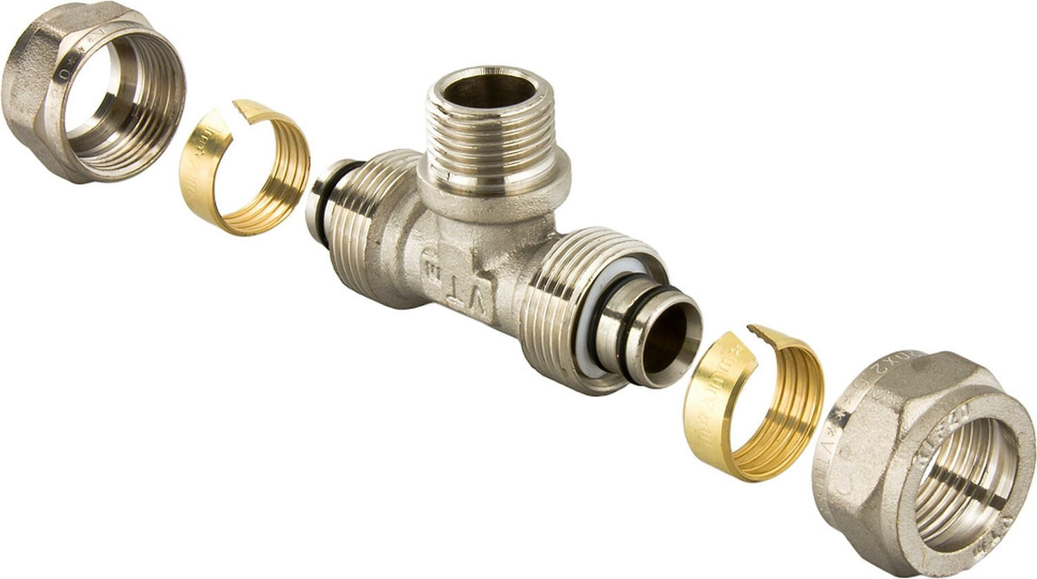 Трехсторонний латунный никелированный фитинг для подсоединения к металлопластиковому трубопроводу компонента с резьбовым подключением.