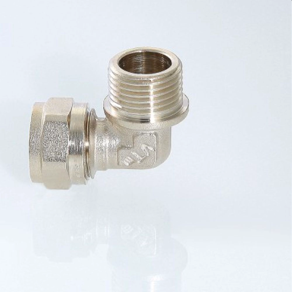 Угловой латунный никелированный обжимной фитинг для соединения металлополимерного трубопровода с компонентом системы, имеющим резьбовое подключение, 16 х 1/2". Резьба фитинга - наружная трубная, по ГОСТу 6357. Cерия VTm.353.N