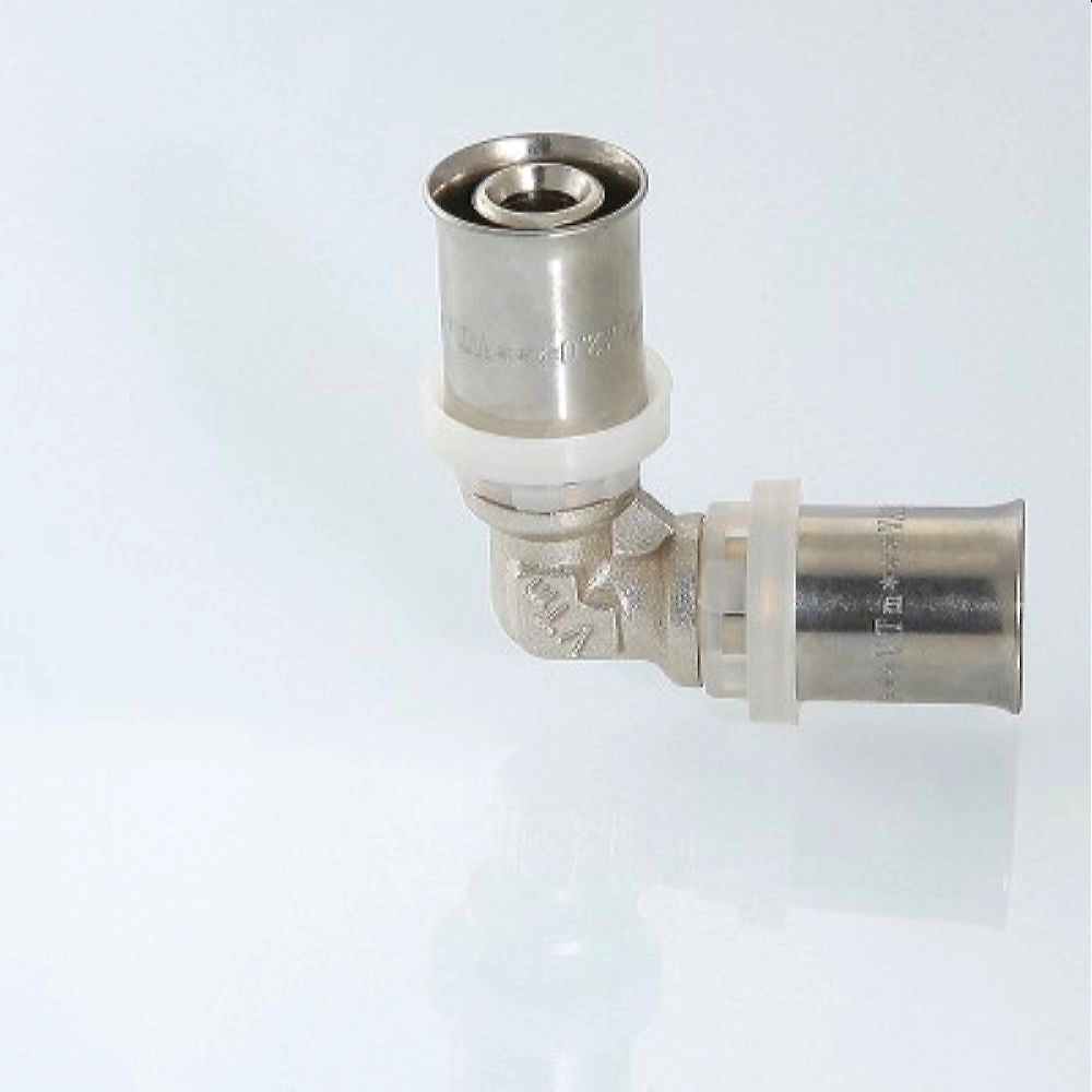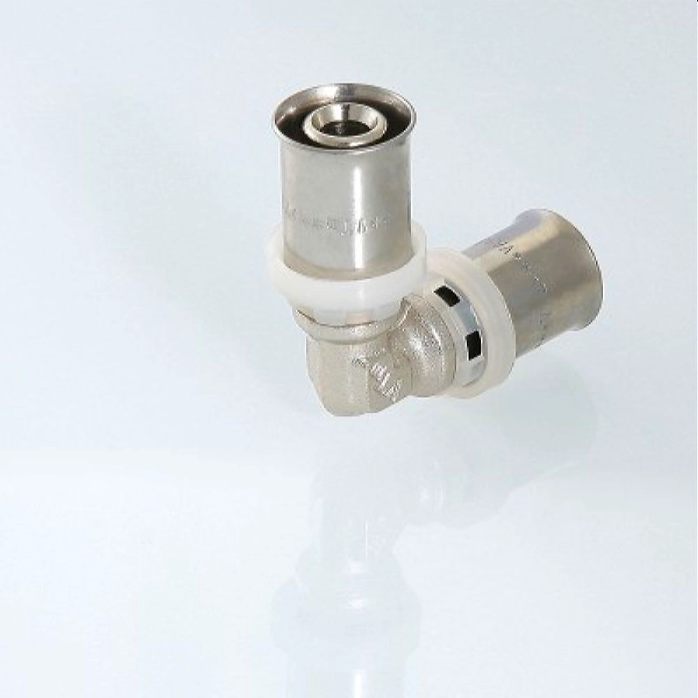 p>Угловой пресс - фитинг для соединения двух металлополимерных труб равного диаметра. Материал - сантехническая латунь, диаметр 16 мм. Cерия VTm.251.N
