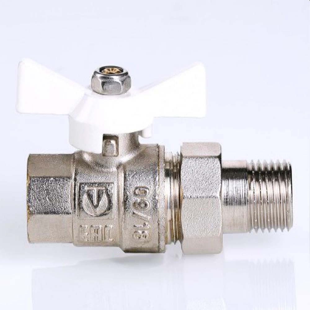 Прямой полнопроходной ремонтопригодный шаровый кран с увеличенным ресурсом, 1/2". Соединен накидной гайкой с резьбовым полусгоном. Корпуса деталей - латунные, никелированные. Кран оснащен ручкой типа "бабочка" с утолщенной стенкой из алюминиевого сплава.