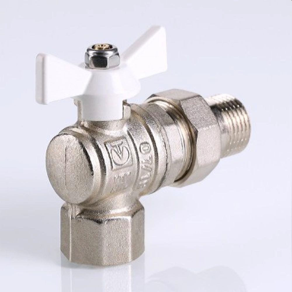 Угловой полнопроходной ремонтопригодный шаровой кран с увеличенным ресурсом. Соединен накидной гайкой с резьбовым полусгоном. Наличие полусгона позволяет монтировать и демонтировать кран без демонтажа трубопровода. Корпуса деталей - латунные, никелированные