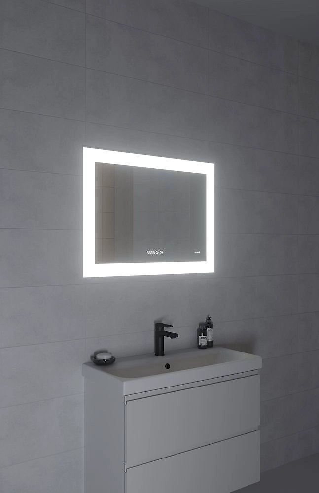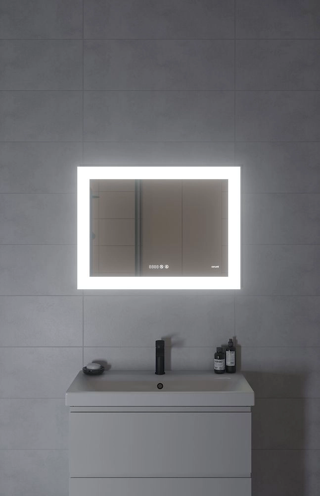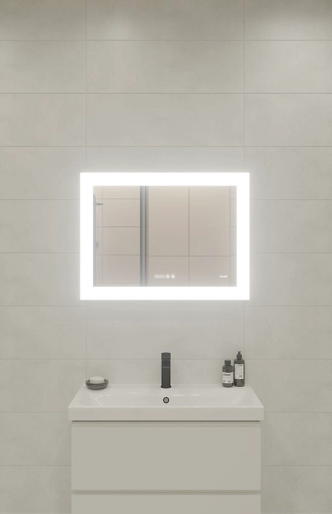 Зеркало LED c подсветкой, с фукцией антизапотевания и часами сочетается с мебелью для ванной комнаты, подходит для размещения в помещениях с повышенной влажностью.