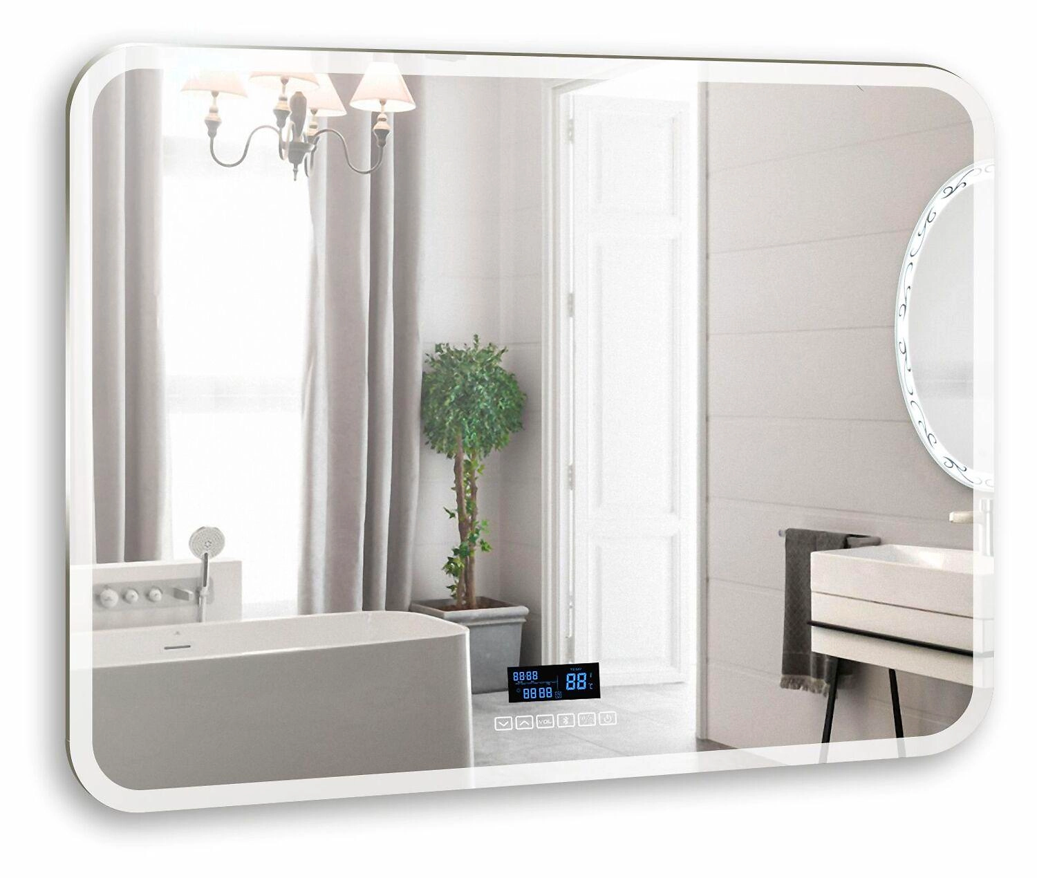 Зеркало с подсветкой и сенсорным дисплеем Стив - стильный завершающий акцент в оформлении интерьера ванной комнаты. Настенный аксессуар выполнен в классическом белом цвете, имеет элегантную форму с закругленными краями. Разнообразные встроенные функции: часы, термометр, bluetooth и динамик, превращают обычное зеркало в удобный современный гаджет.