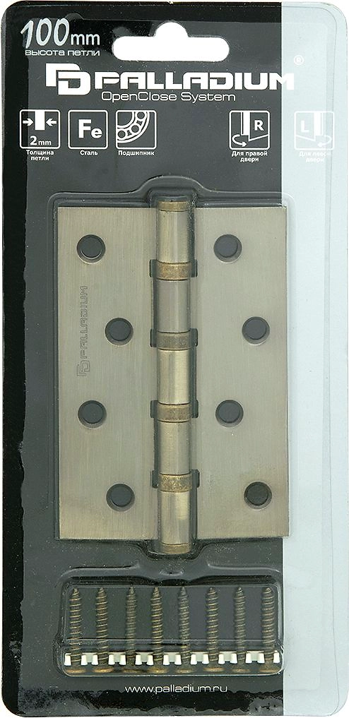 В комплекте: универсальная дверная петля Palladium N 4BB-100 2 mm (1 шт.), шурупы в цвет (8 шт.)