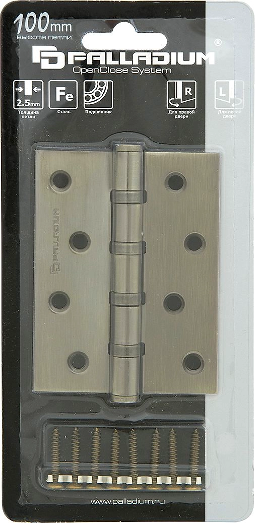 В комплекте: универсальная врезная петля Palladium N 500 C-S-4" (1 шт), шурупы в цвет (8 шт)