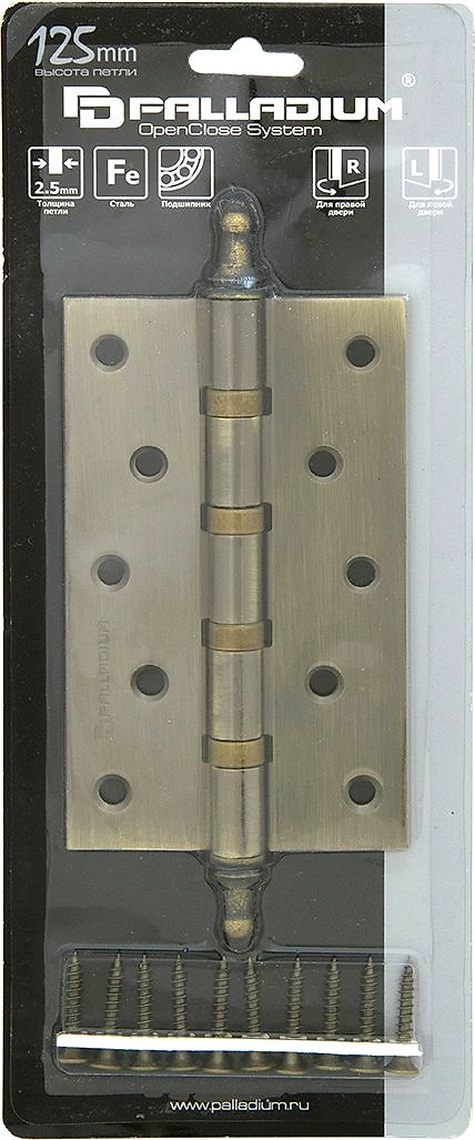 В комплекте: универсальная врезная петля Palladium N 500 A-S-5(1 шт.), шурупы в цвет (10 шт.).