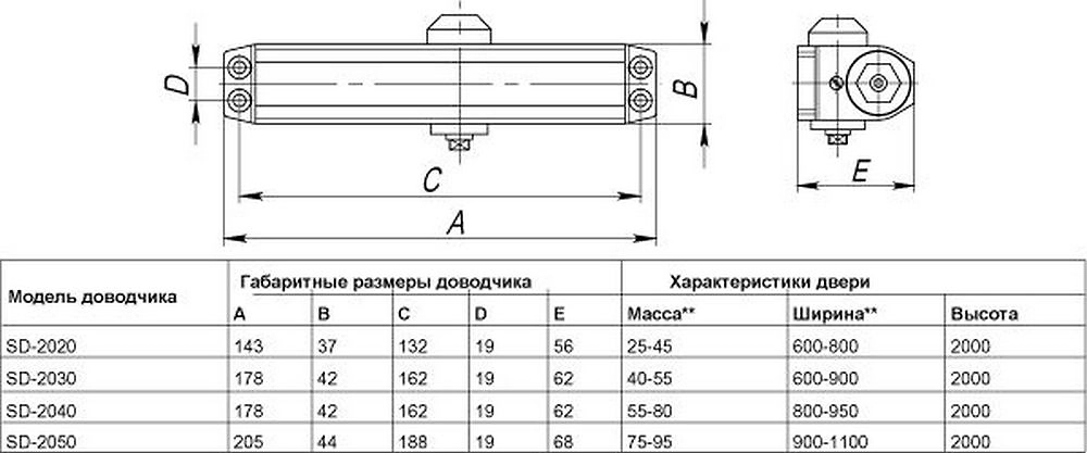 Дверной доводчик SD-2030 предназначен для установки на двери, весом 40-55 кг. Имеет две отдельные регулировки: дохлопа двери и скорости ее закрывания.