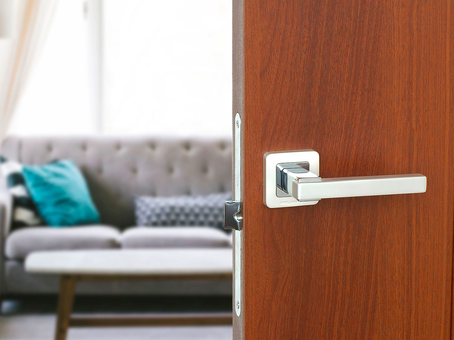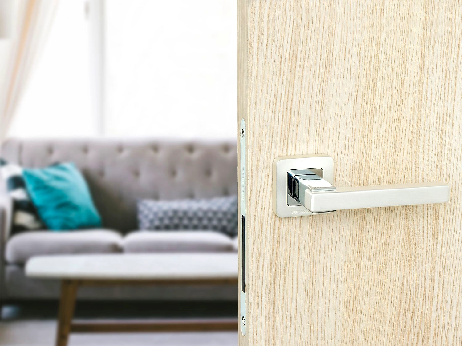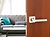 Эта дверная ручка на квадратной розетке впечатляет подчеркнутой геометрией, контрастной расцветкой и игрой мата с глянцем.