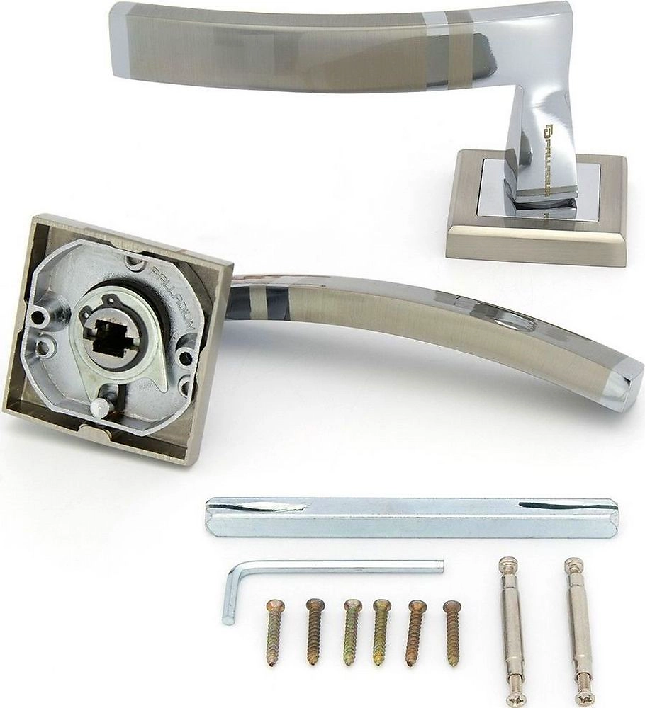 Palladium A Tesoro – двухцветная дверная ручка для входных и межкомнатных дверей. Отлично подходит к современным деревянным и металлическим полотнам. Рекомендуем, если вам нравятся узкие ручки на квадратной розетке с рычагом средней длины (132 мм).