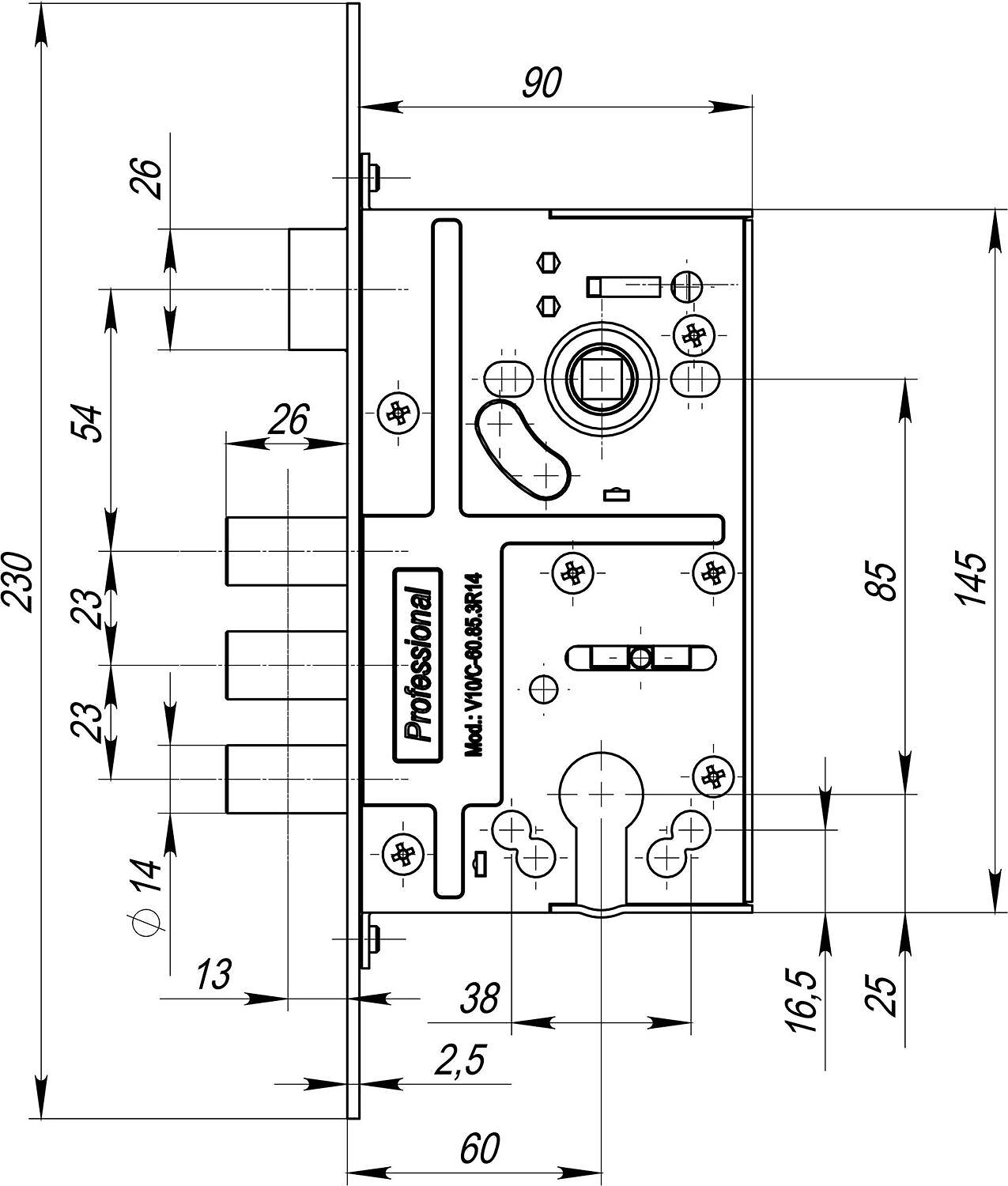 Корпус врезного цилиндрового замка Fuaro V10/C-60.00.3R14 с тремя ригелями и защелкой предназначен для установки во входные и технические металлические двери. Стальной оцинкованный корпус. Универсальная реверсивная защелка, подходит для левых и правых дверей. Отверстия под стяжные винты. Размер бэксета- 60 мм. Выход ригелей- 26 мм. Диаметр ригелей -14 мм. Открывание-2 полуоборота.