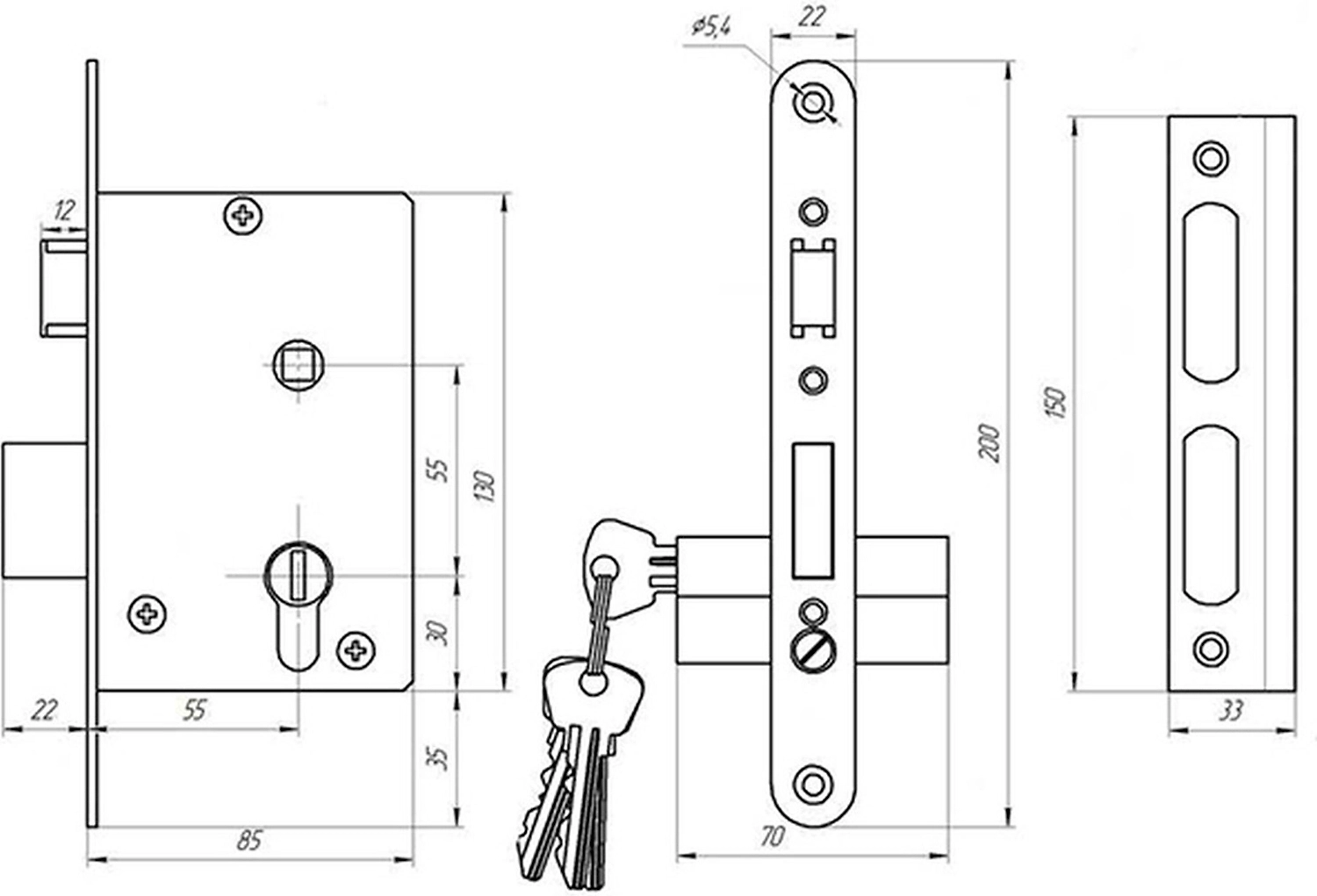 Замок врезной цилиндровый ЗВ4-3.03 предназначен для установки в деревянные и металлические двери толщиной 35-55 мм, правого и левого открывания. Прямоугольный ригель.