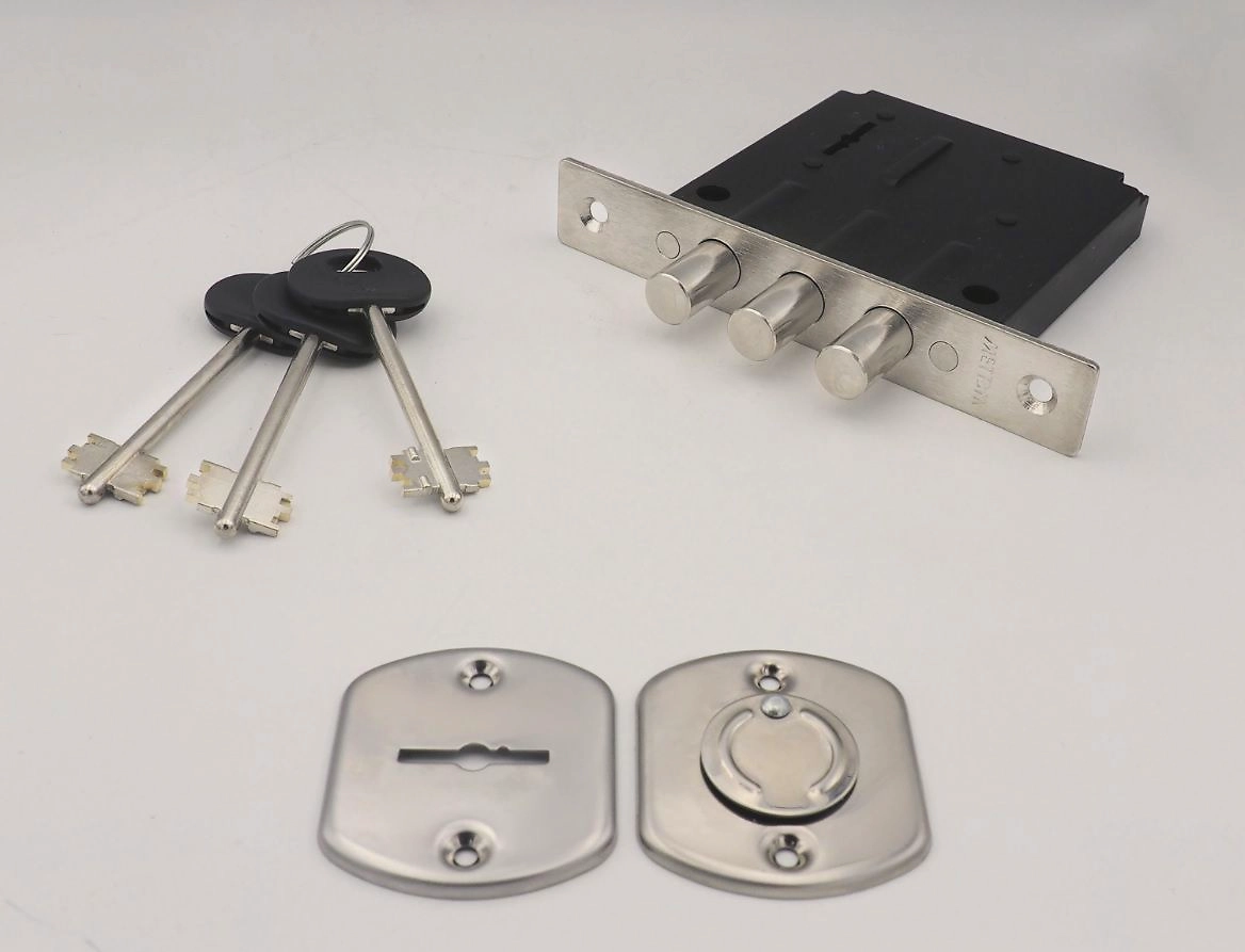 Замок имеет одно направление запирания. Три стальных ригеля надежно фиксируют дверь. Замок комплектуется лицевой планкой из высококачественной стали, декоративными накладками из нержавеющей стали и тремя или пятью латунными ключами с пластиковыми головками.