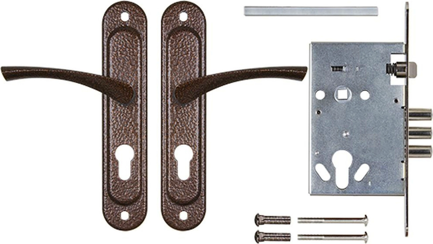 Корпус врезного замка с защелкой и фалевыми ручками на планке KIT А5-3155/3 W/B предназначен для установки на двери общественных и жилых помещений. Может монтироваться на левых и правых дверях, открывающихся наружу и во внутрь. В фалевые ручки на планке добавлены пружины и фиксаторы, что исключает "провисание" и обеспечивает четкую фиксацию их положения. Ручки изготовлены из алюминиевого сплава, а накладки из стали и покрыты полимерной краской, цвет: медный антик. Цилиндр и ответная планка в комплект не входят.