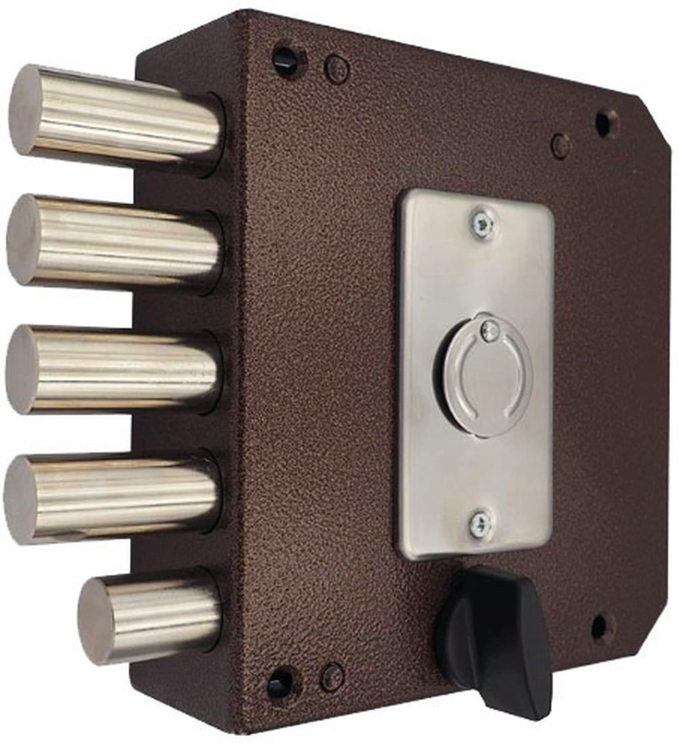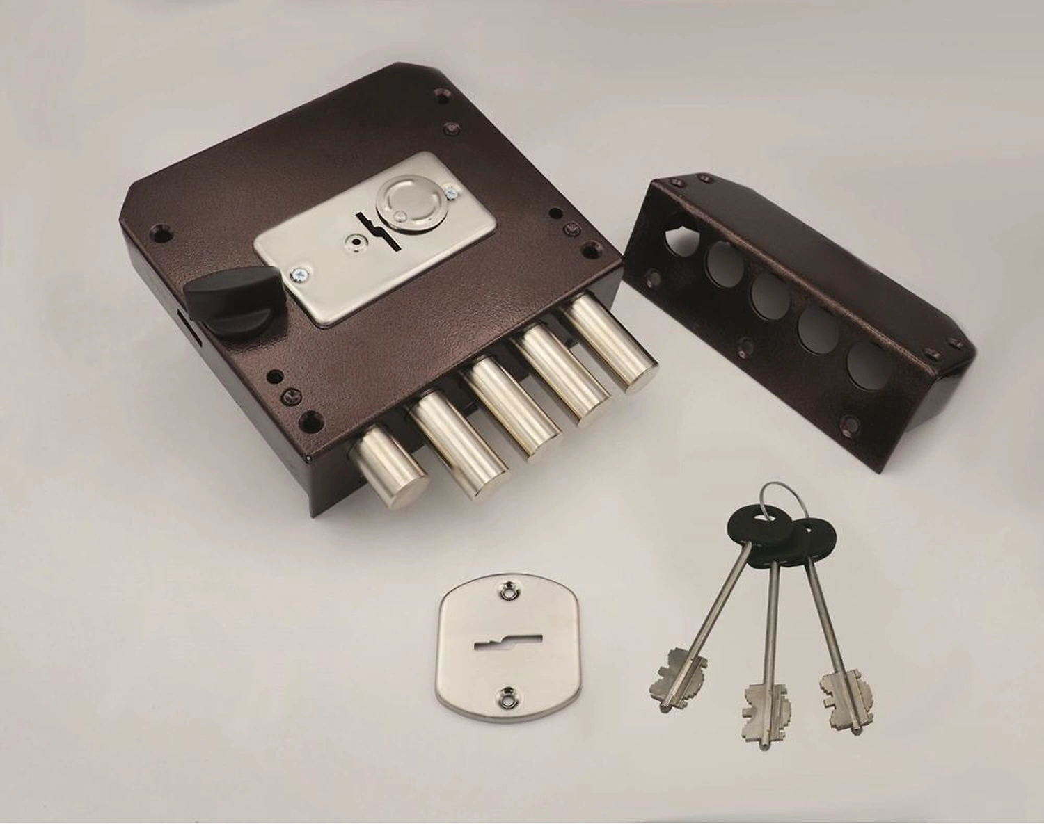 Замок запирает дверь пятью стальными ригелями и задвижкой. Диаметр ригелей засова и задвижки - 18 мм. Ригели выдвигаются из корпуса замка на 40 мм и 24 мм соответственно. В одном из ригелей расположен закаленный стальной стержень, обеспечивающий надежную защиту от перепиливания. При помощи данного замка дверь запирается на четыре полных оборота (возможно неполное запирание двери на два оборота), а также дополнительно изнутри - на задвижку.
