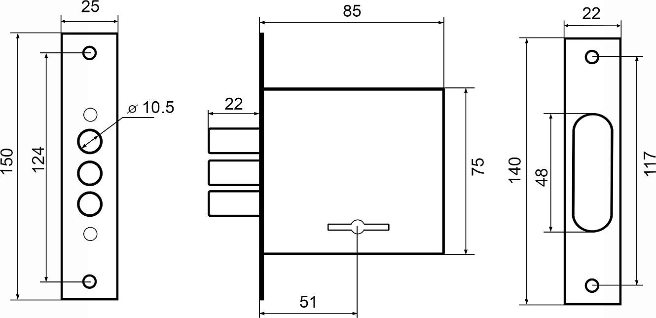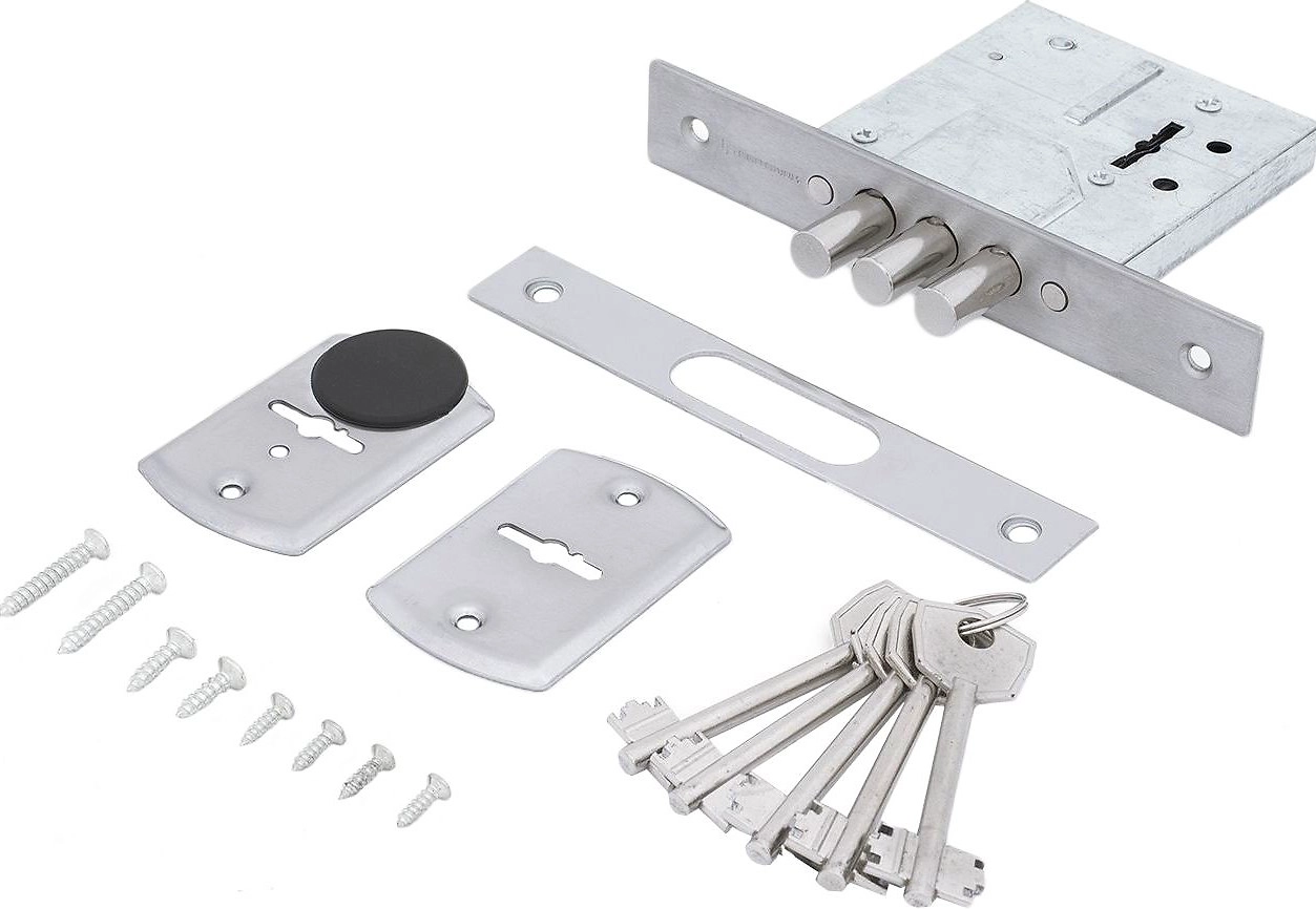 Врезной замок без защелки для межкомнатных и входных дверей. Высокий уровень взломостойкости. Качество гальванического покрытия подтверждено тестом на устойчивость в камере соляного тумана - более 72 часов. В комплекте поставки входит замок,ответная планка,декоративная накладка на ключевое отверстие,шурупы,5 сувальдных ключей с двойной бородкой.