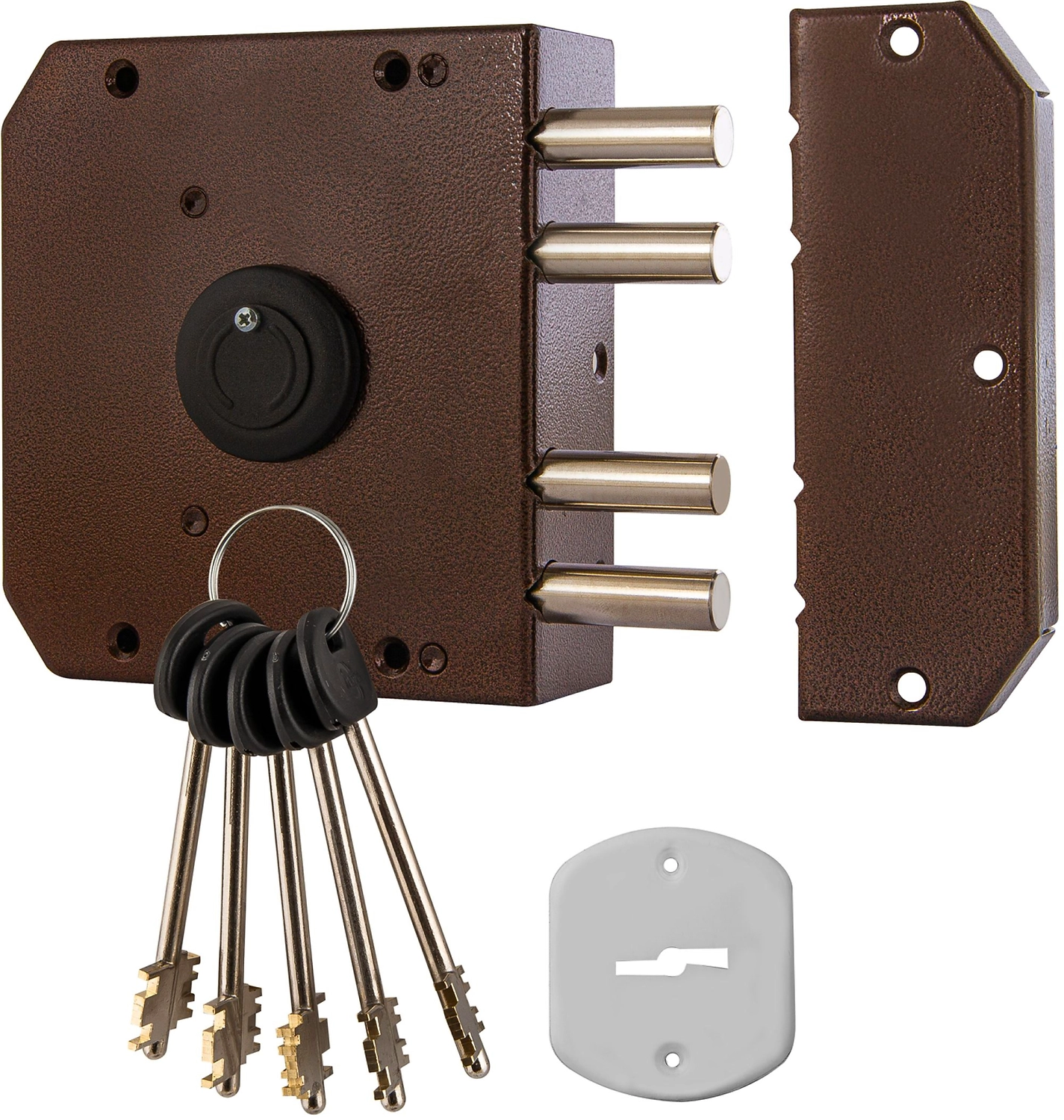 Модель комплектуется пятью латунными ключами и декоративной накладкой из нержавеющей стали (для внешней стороны двери).