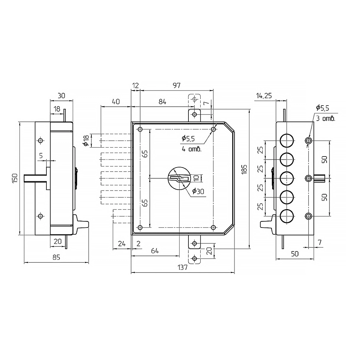 Замок запирает дверь пятью стальными ригелями диаметром 14 мм, которые выдвигаются из корпуса замка на 40 мм.