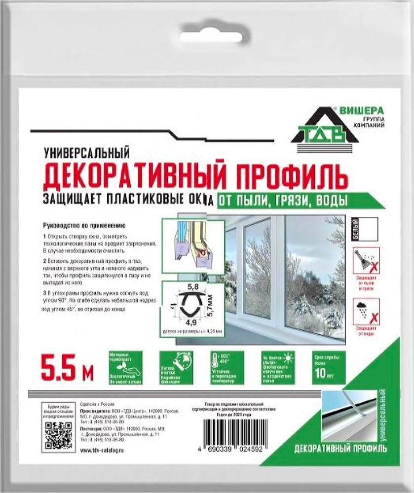 Уплотнитель для ПВХ окон декоративный универсальный белый 5,5 м