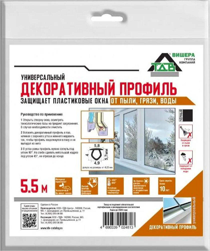 Уплотнитель для ПВХ окон декоративный универсальный черный 5,5 м