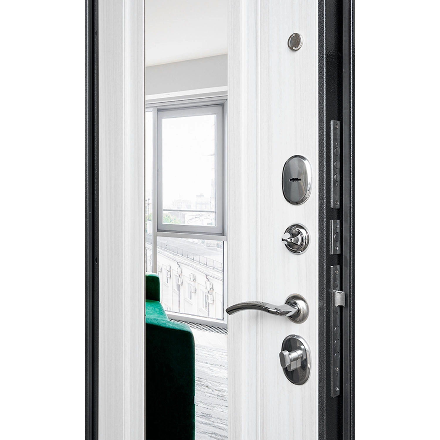 Дверь оснащена двумя замками разного класса: основной цилиндровый и дополнительный сувальдный, что увеличивает взломостойкость самой двери. Ночной сторож (ночная задвижка) обеспечит защиту помещения от проникновения с внутренней стороны квартиры без возможности открытия двери снаружи. Глазок позволит увидеть посетителя без открывания двери.