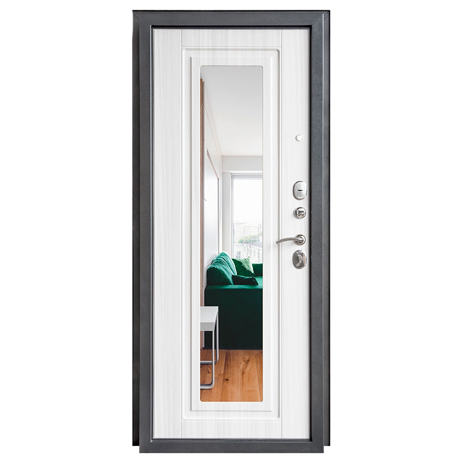 Дверь металлическая ДК 70 зеркало 860х2050 левая - это современная дверь, имеющая с наружной стороны гладкий лист металла, покрытого порошковой краской антик серебристый, с внутренней - панель МДФ,