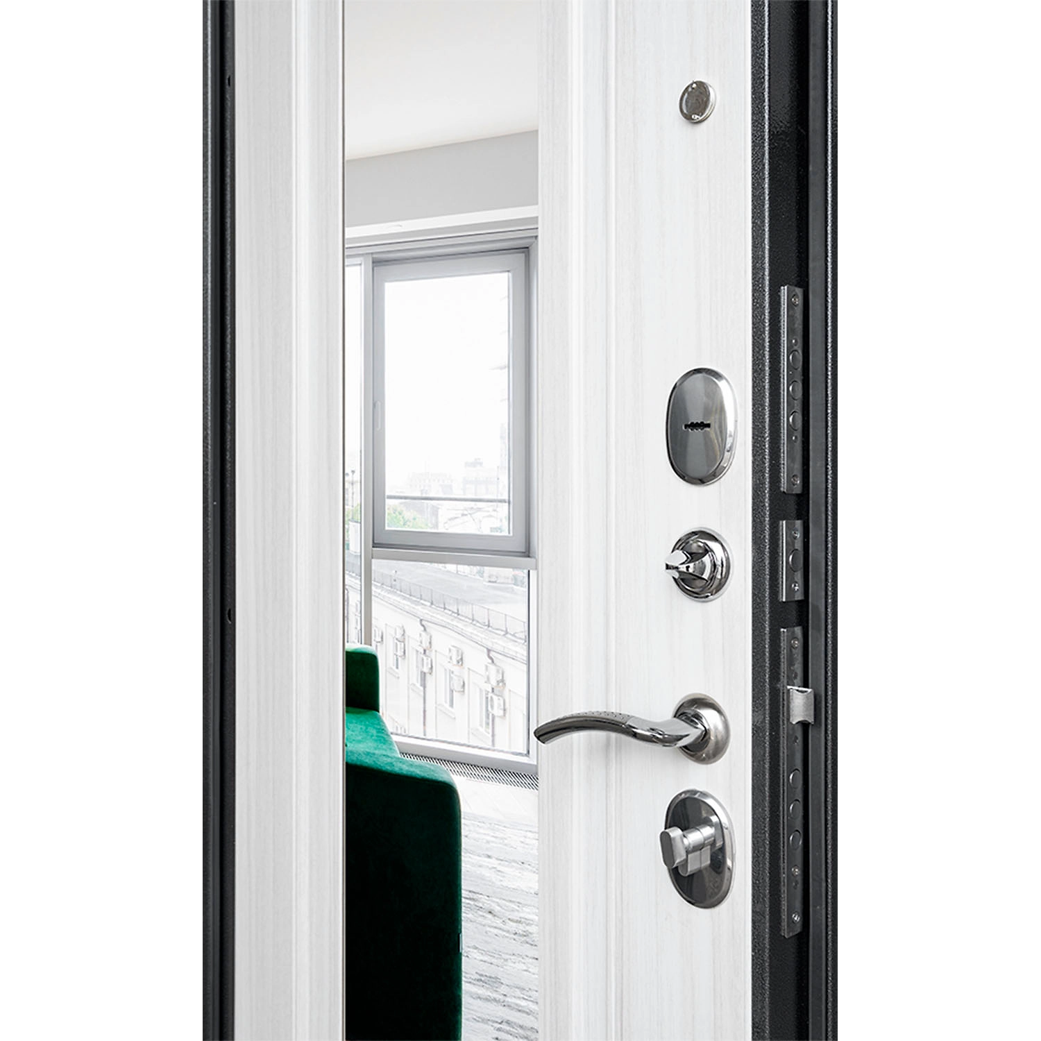 Дверь оснащена двумя замками разного класса: основной цилиндровый и дополнительный сувальдный, что увеличивает взломостойкость самой двери. Ночной сторож (ночная задвижка) обеспечит защиту помещения от проникновения с внутренней стороны квартиры без возможности открытия двери снаружи. Глазок позволит увидеть посетителя, без открывания самой двери.