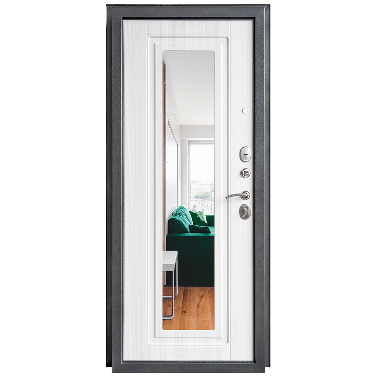 Дверь металлическая ДК 70 зеркало 860х2050 правая- это современная дверь, имеющая с наружной стороны гладкий лист металла, покрытого порошковой краской антик серебристый, с внутренней - панель МДФ,