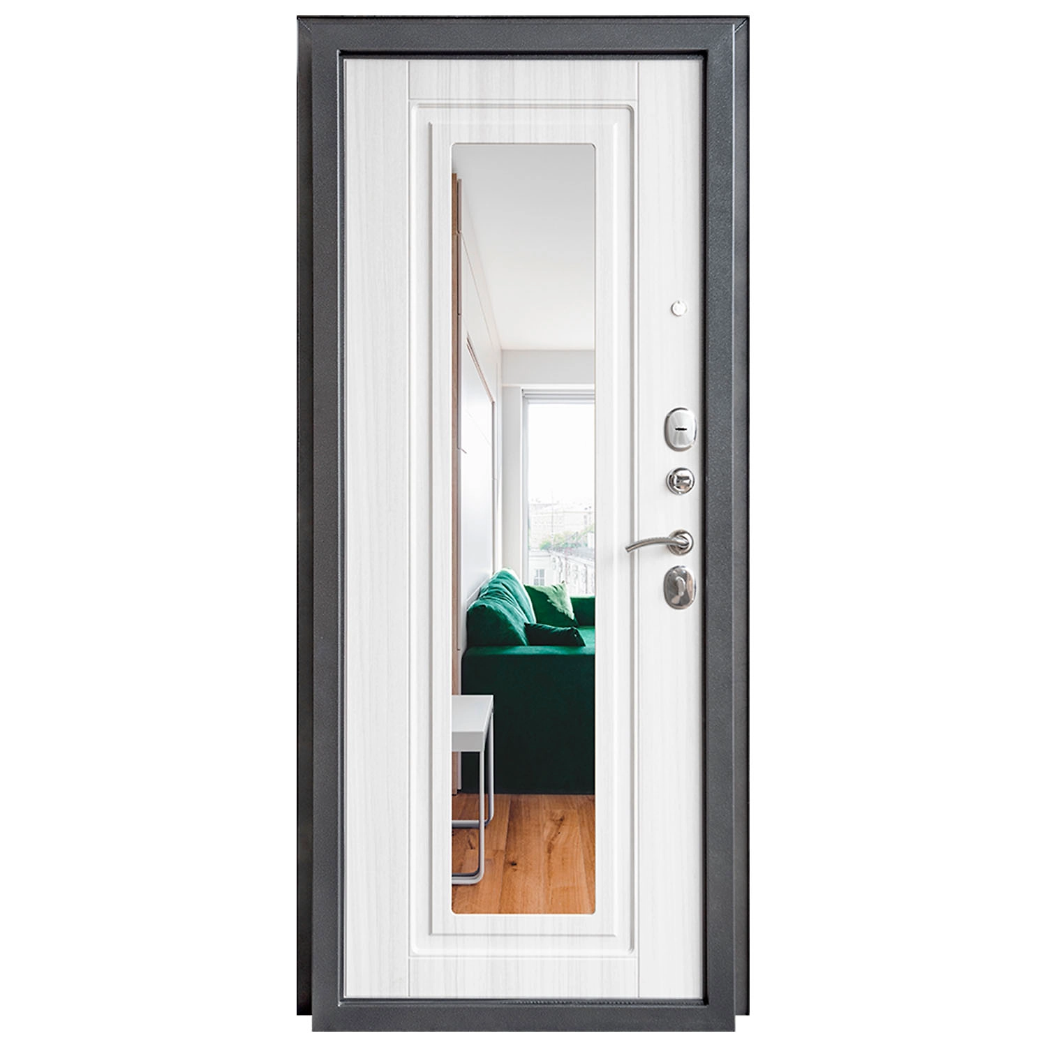 Дверь металлическая ДК 70 зеркало 960х2050 правая - это современная дверь, имеющая с наружной стороны гладкий лист металла, покрытого порошковой краской антик серебристый, с внутренней - панель МДФ,