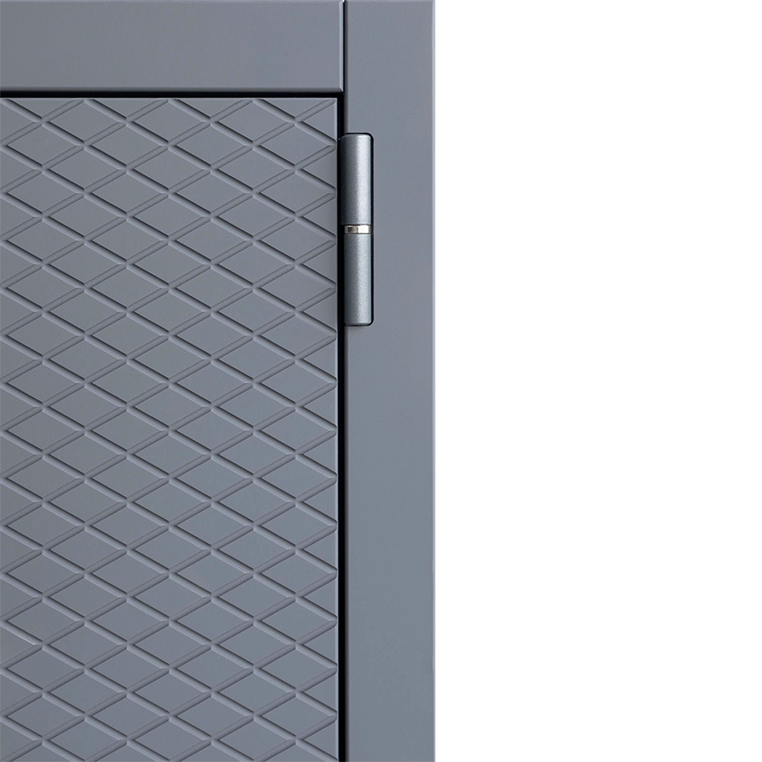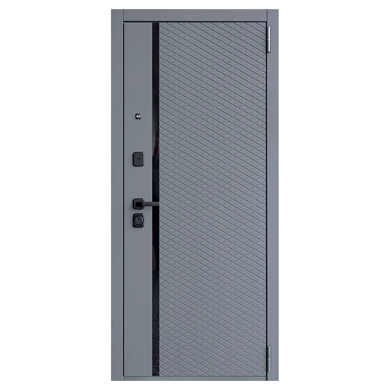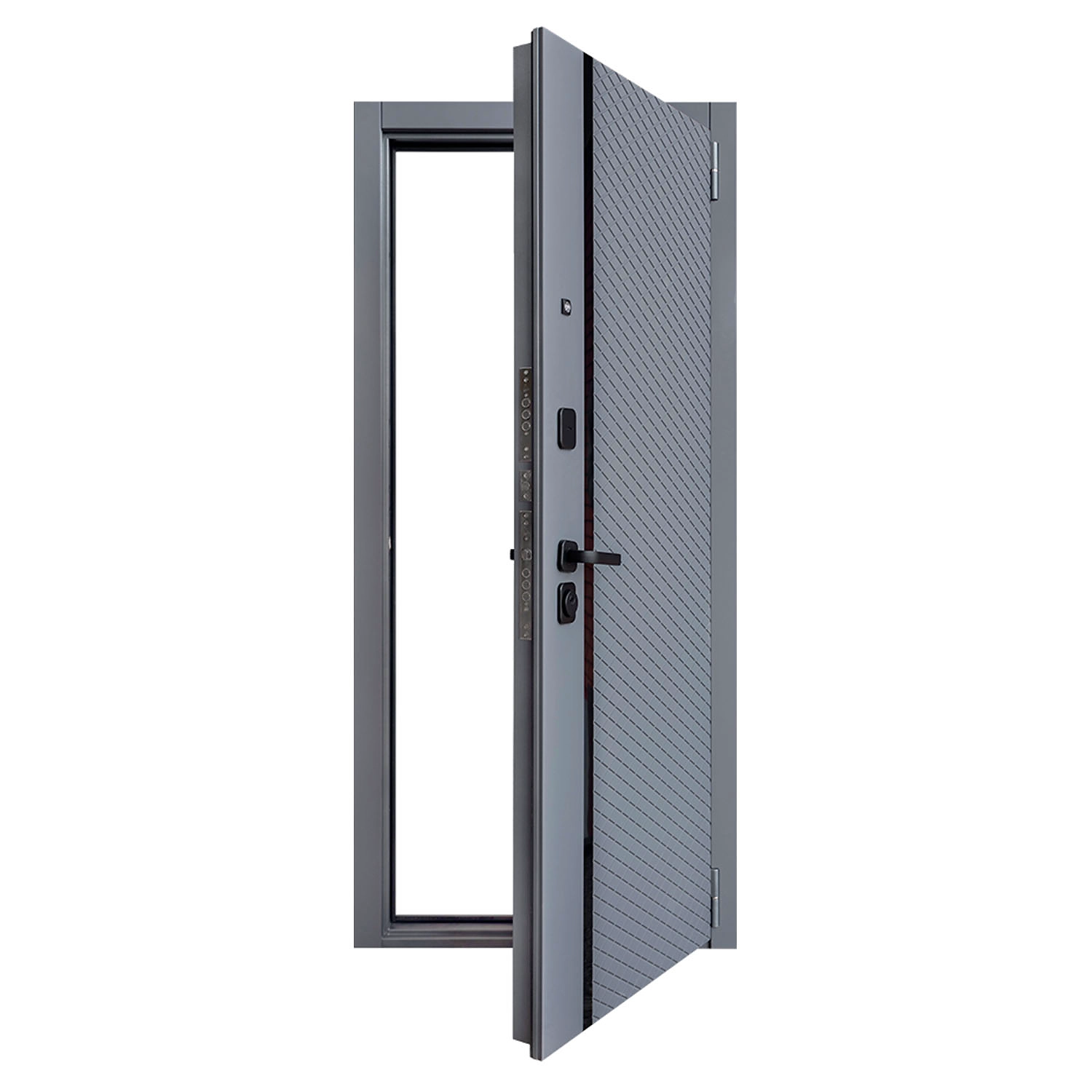 Дверь металлическая ДК 80 Софт 860х2050 правая - это современная дизайнерская дверь, имеющаа снаружи фрезерованную панель МДФ, с установленным на нее молдингом. Покрытие внешней стороны - тактильная пленка серый софт. Внутренняя МДФ панель декорирована пластиковым молдингом, пленка софт белый снег. Цельногнутый короб окрашен порошковой краской серый муар. Наличники декорированы МДФ в цвет полотна. По периметру двери идут два контура уплотнения, которые защищают помещение за дверью от сквозняков и посторонних запахов.
