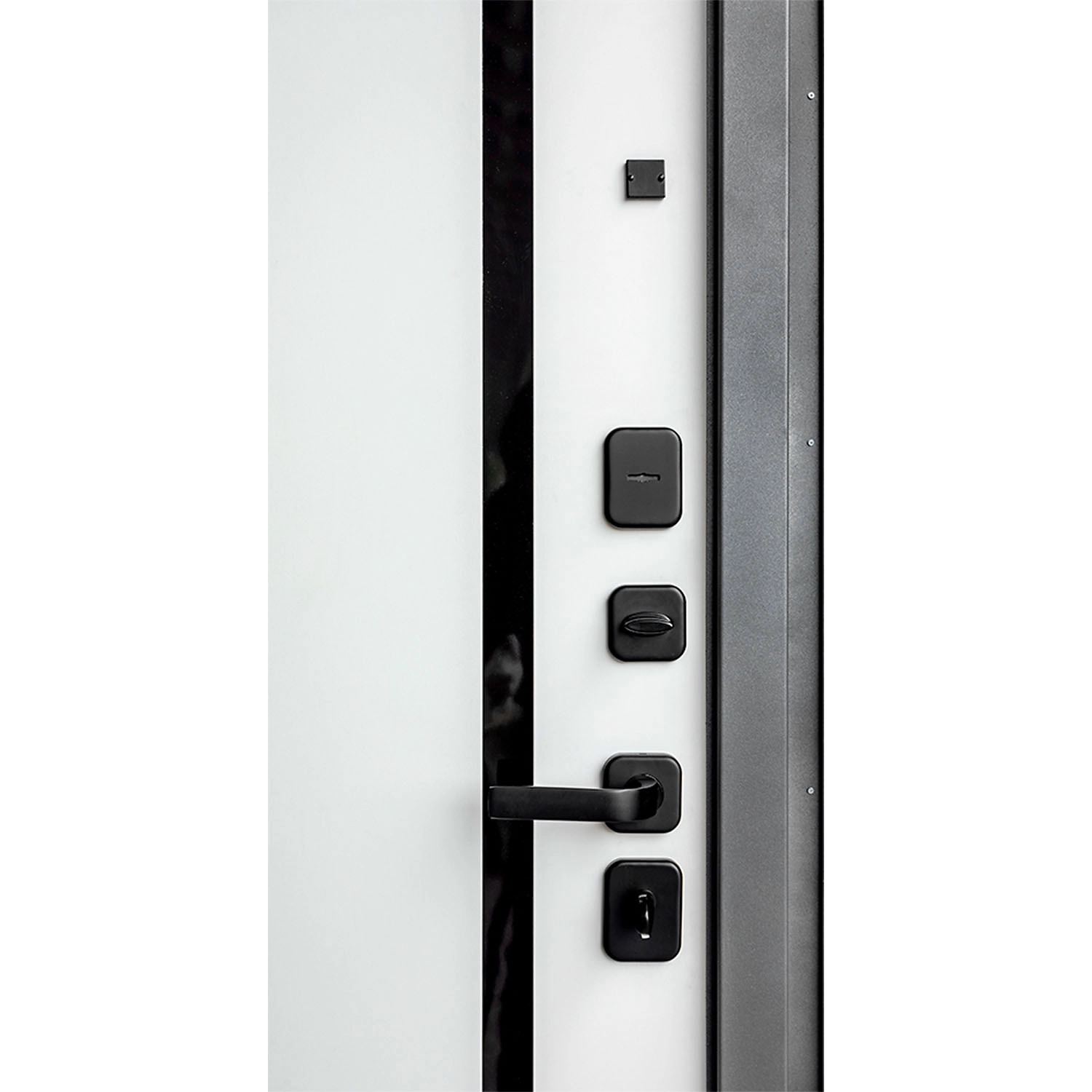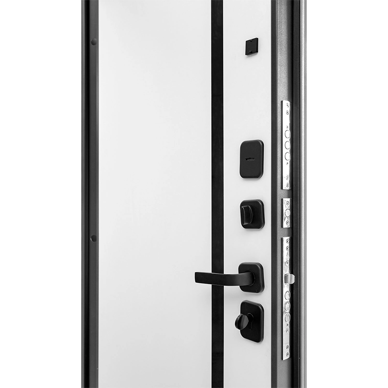 Дверь оснащена двумя замками разного класса: основной цилиндровый с дополнительной защитой врезная броненакладка и дополнительный сувальдный, что увеличивает взломостойкость самой двери. Ночной сторож (ночная задвижка) обеспечит защиту помещения от проникновения с внутренней стороны квартиры без возможности открытия двери снаружи. Глазок позволит увидеть посетителя, без открывания самой двери. Дверь укомплектована дизайнерской фурнитурой черного цвета. Дверь модель ДК 80 Софт можно использовать только в помещениях закрытого типа. Не допускается использование данной двери как уличной.