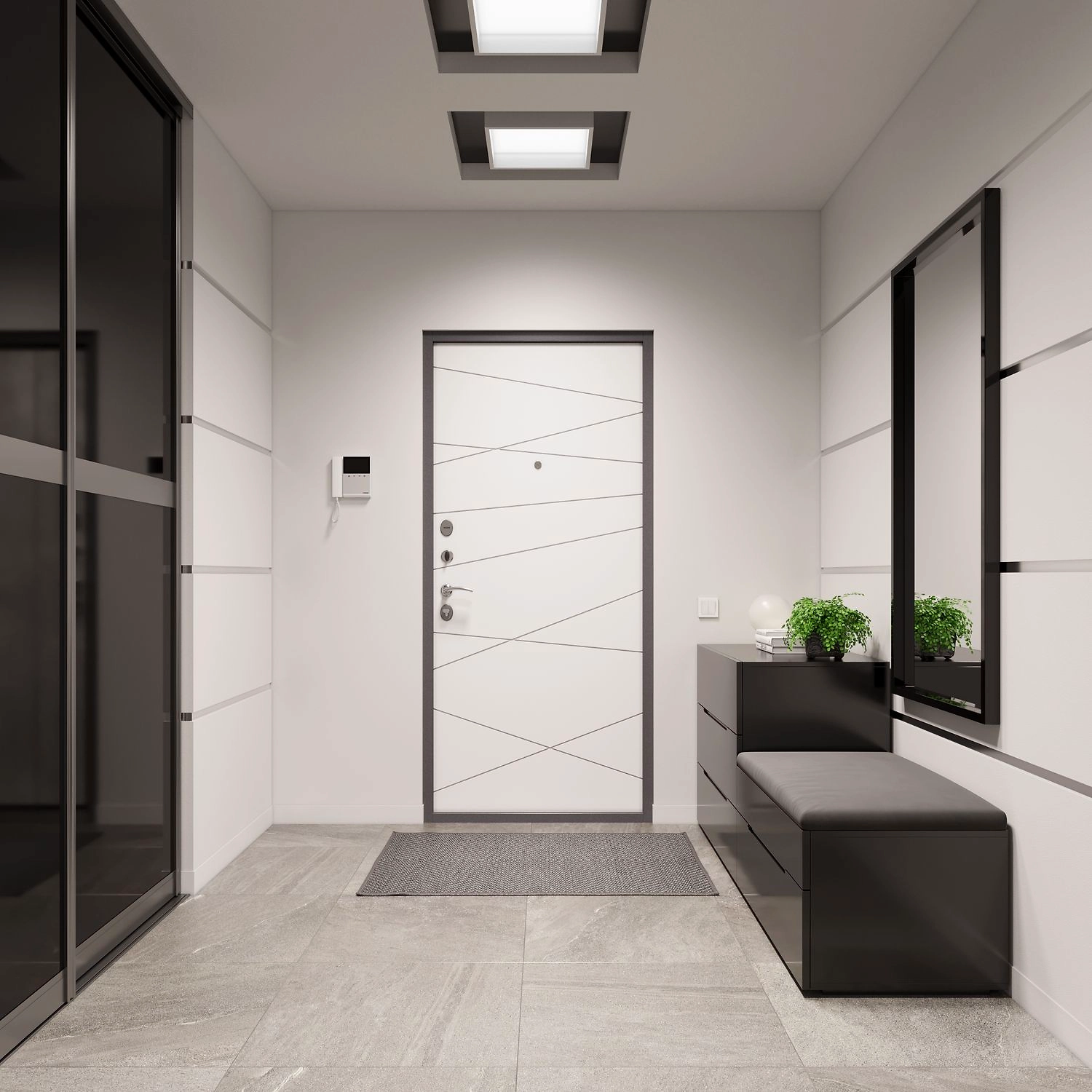 Современный дизайн двери хорошо сочетается с популярными моделями мебели для прихожей. Внутренняя панель с фрезерованными линями в оттенке "Эмаль белоснежная" придает пространству легкость, становится акцентом в темных стенах и "растворяется" в светлых. Наружное полимерное покрытие "Букле графит" отлично вписывается в урбанистическую стилистику пространства.