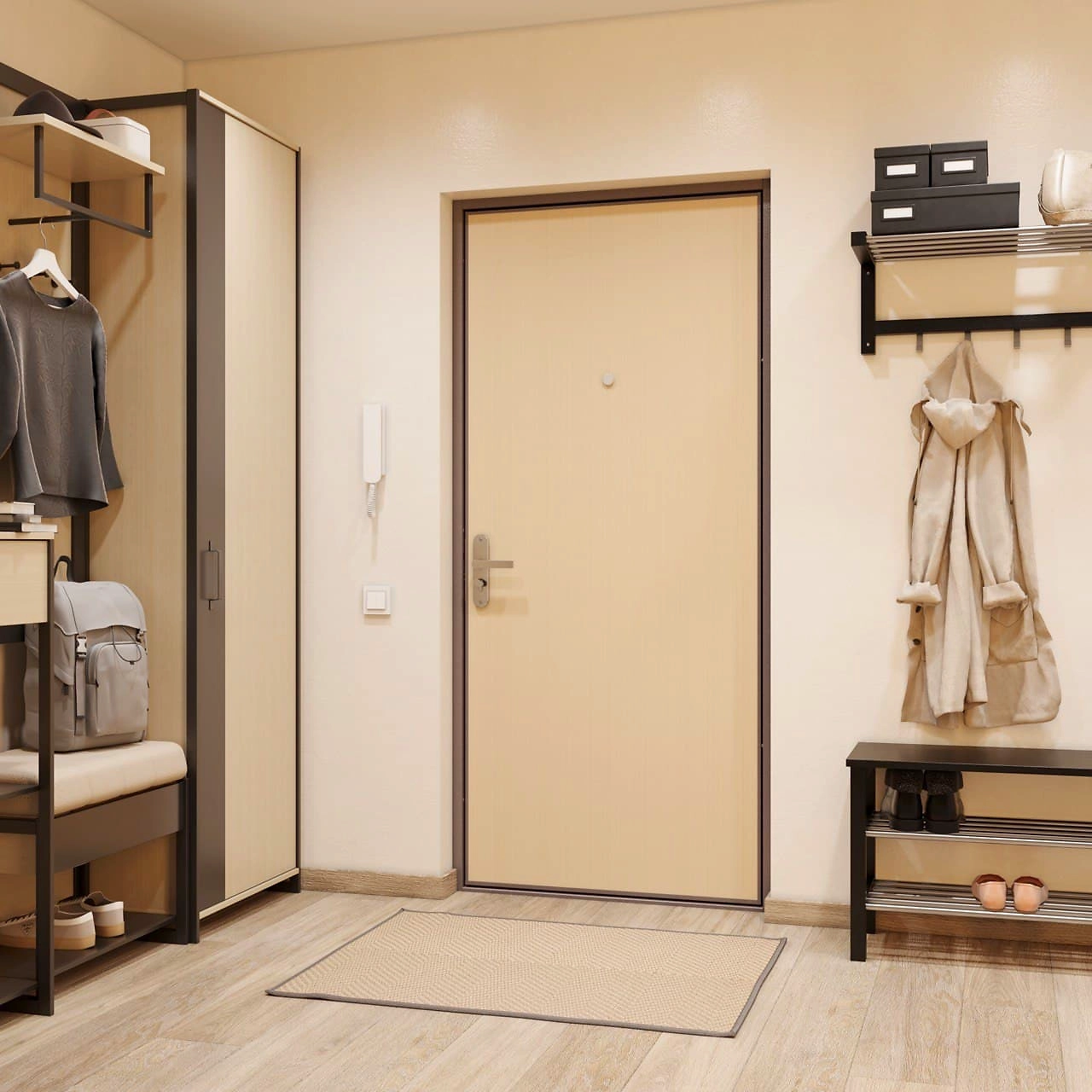 Стальная квартирная дверь, главное преимущество которой – экономичная цена и базовая комплектация. Такое сочетание делает ее подходящим решением для дачи, для технических помещений.