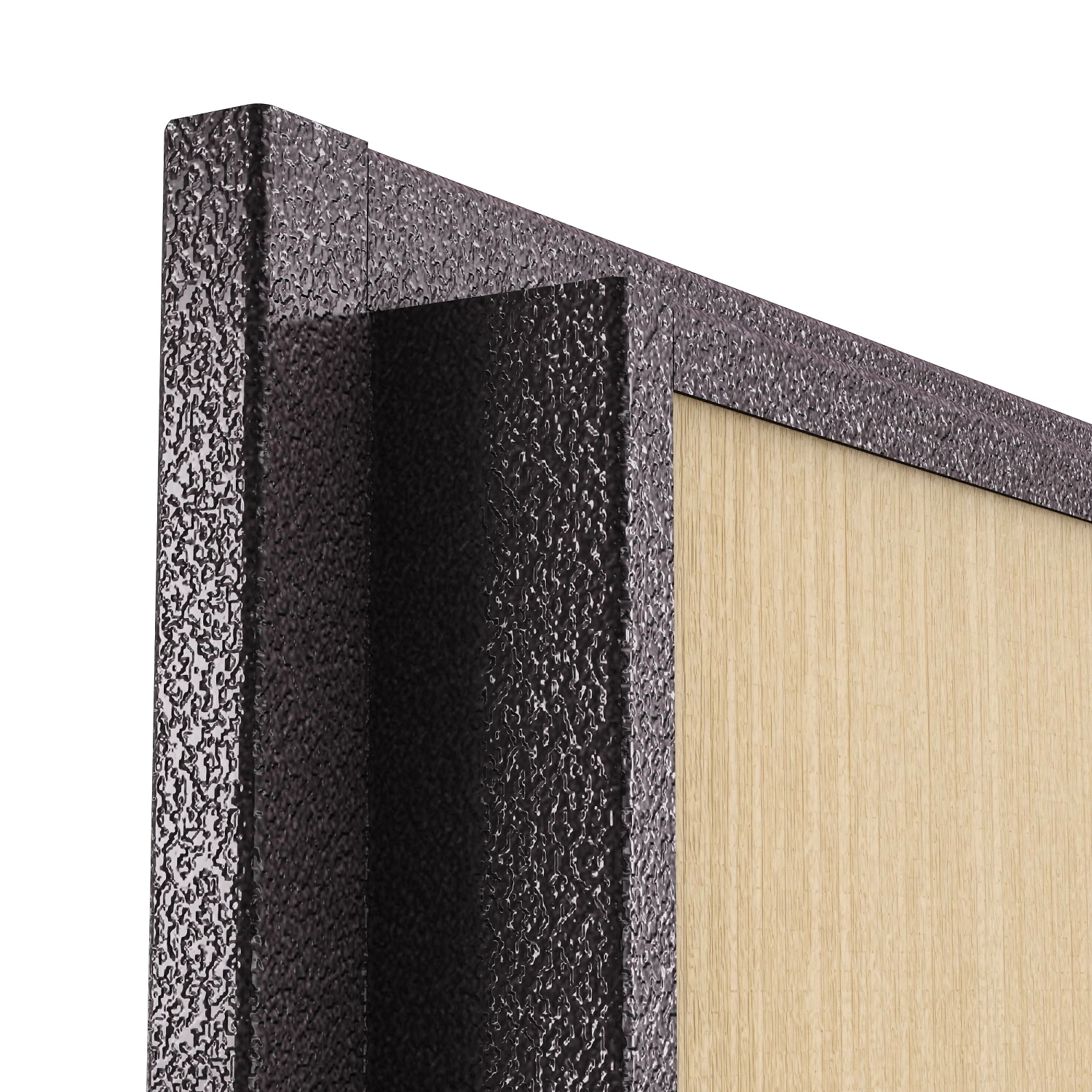 Короб и полотно двери изготовлены из холоднокатаной листовой стали на высокотехнологичном оборудовании, все сварные швы выполнены на роботизированных комплексах – они равномерные и прочные. Это означает дверь в проем встанет ровно, выглядеть будет аккуратно, и служить долго. Дополнительную прочность полотна обеспечивает каркас из композитного материала, проходящий по его внутреннему периметру. Наполнение полотна – пенополистирол, проложен по всему объему. Он обеспечивает функцию теплошумоизоляции. Глубина короба 60 мм, толщина полотна 45 мм. Прочность конструкции соответствуют требованиям ГОСТ. Вы можете доверить этой двери сохранность имущества.
