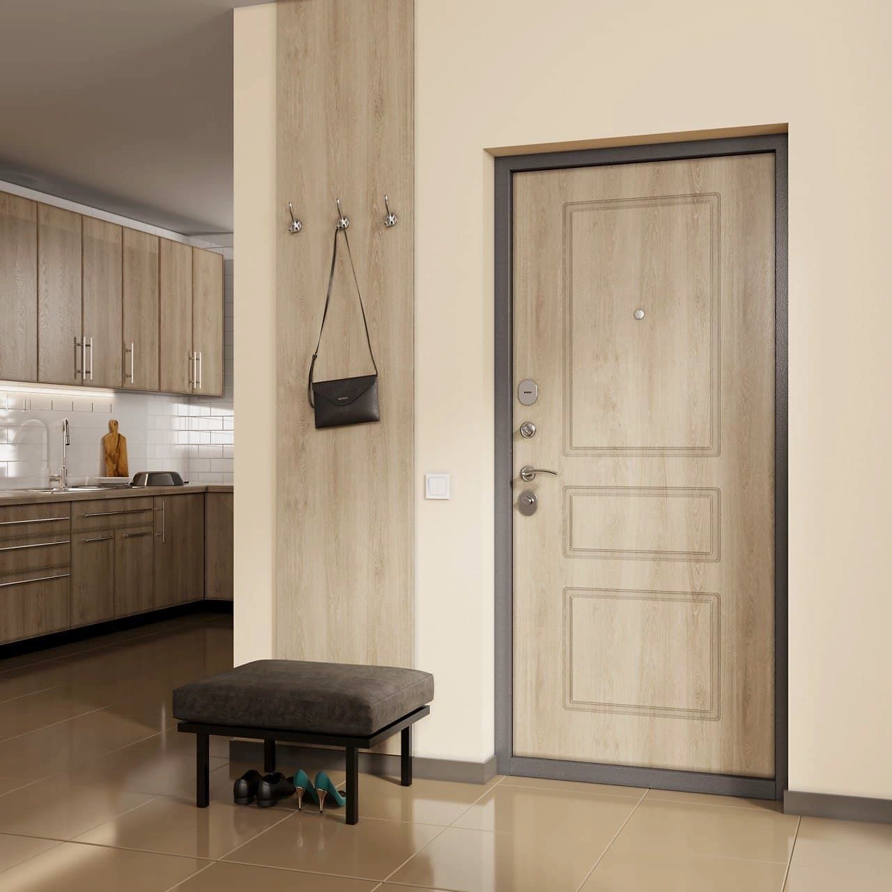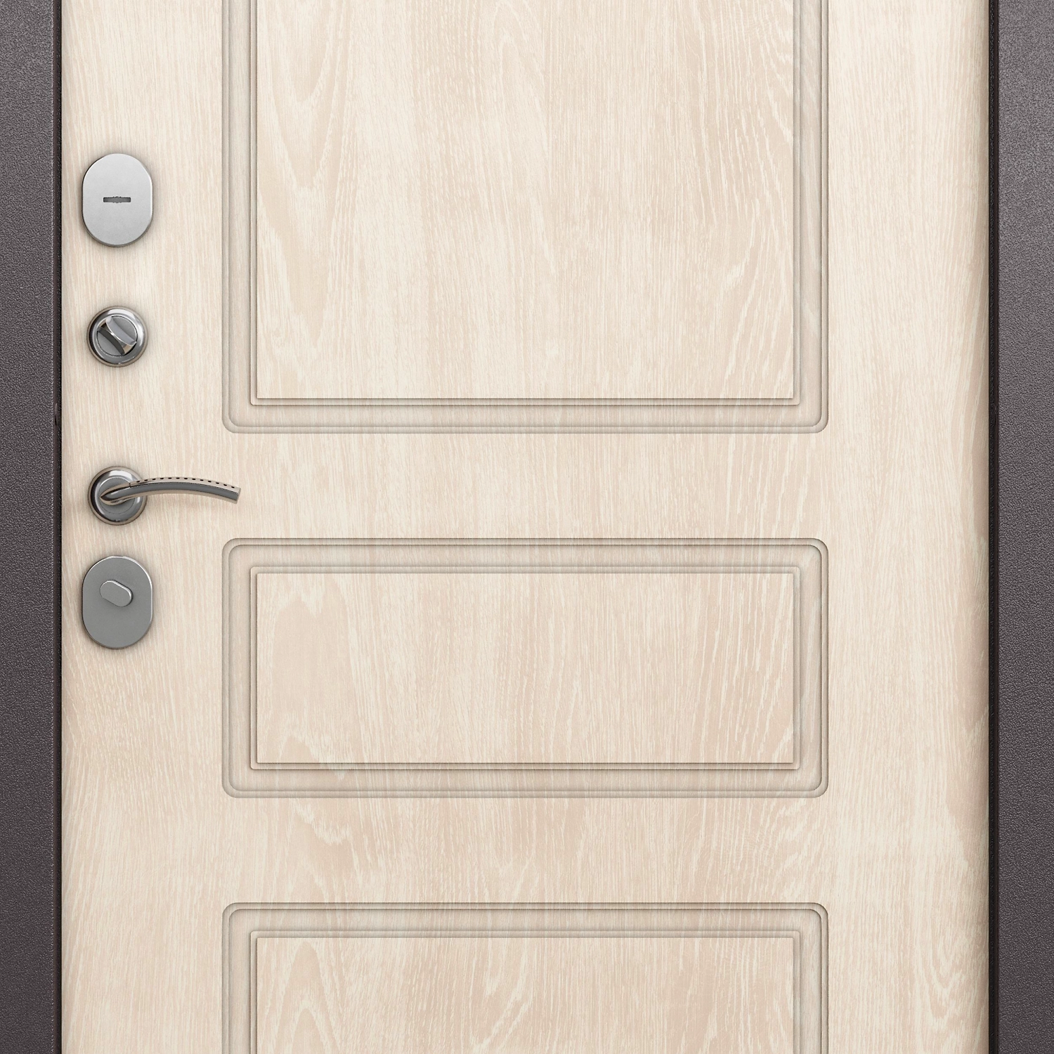 Стальная входная дверь Дагер светлый дуб правая 205x96 см устанавливается в жилых домах на границе подъезд-квартира. Благодаря универсальному дизайну с фрезерованным рисунком, стилизованным под трехфиленчатое полотно, дверь подходит как для классических, так и для современных интерьеров.