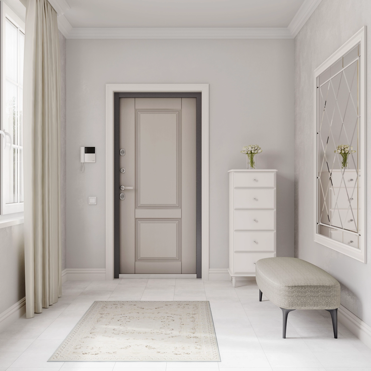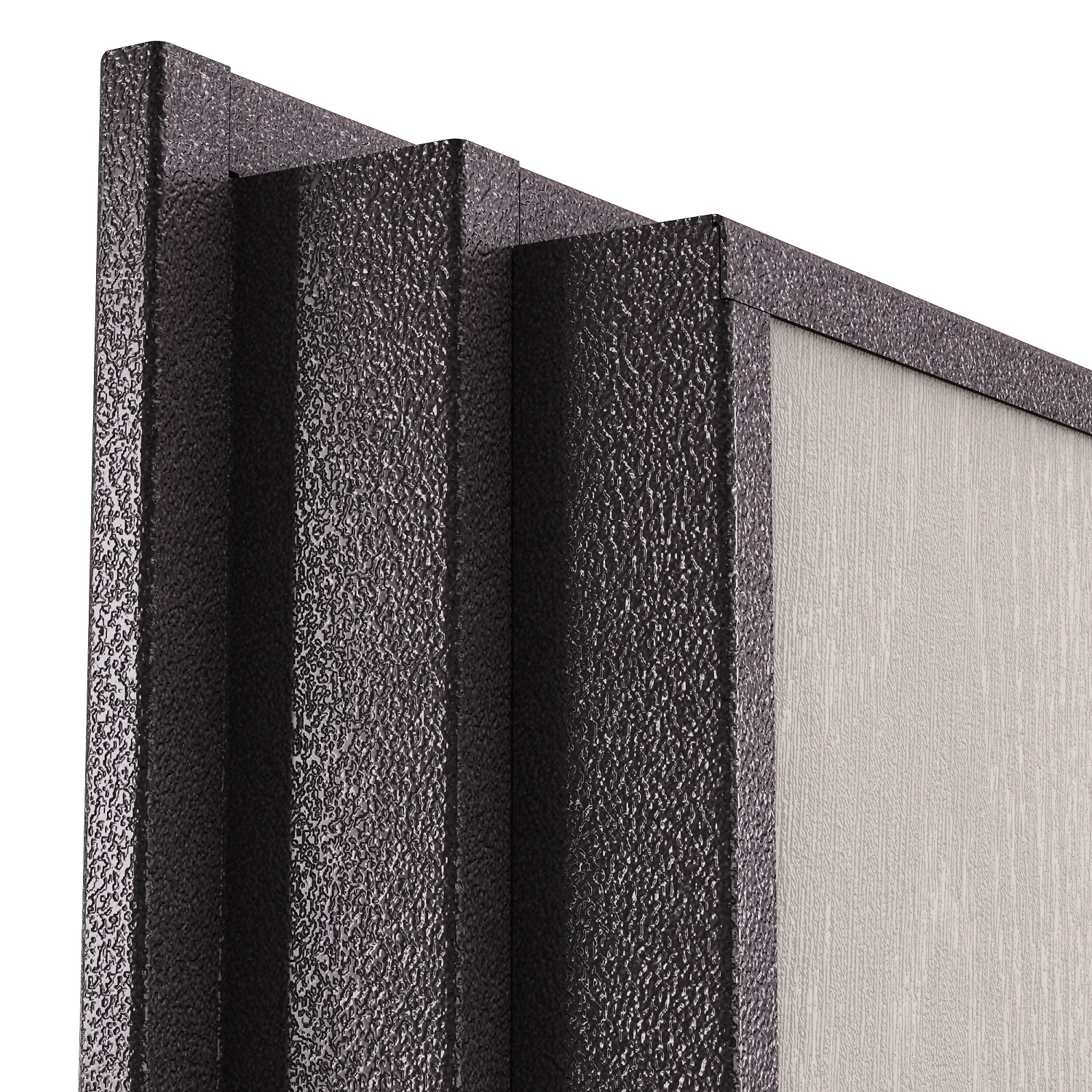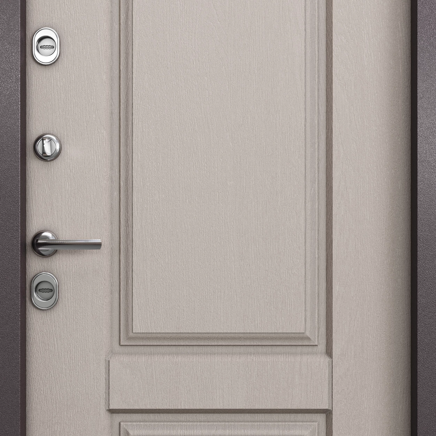 Фасад двери обшит металлическим полотном с антикоррозионным полимерным покрытием. Внутренняя отделка представляет собой декоративную МДФ-панель толщиной 10 мм, которая также выполняет защитную и изоляционную функции. Наполнение полотна многослойное - пенополистирол и минеральная плита, проложенные по всему периметру конструкции. На дверь установлены два замка с сувальдным механизмом. Модель с деликатной фрезеровкой гармонично смотрится в интерьере в традиционном и классическом стиле.