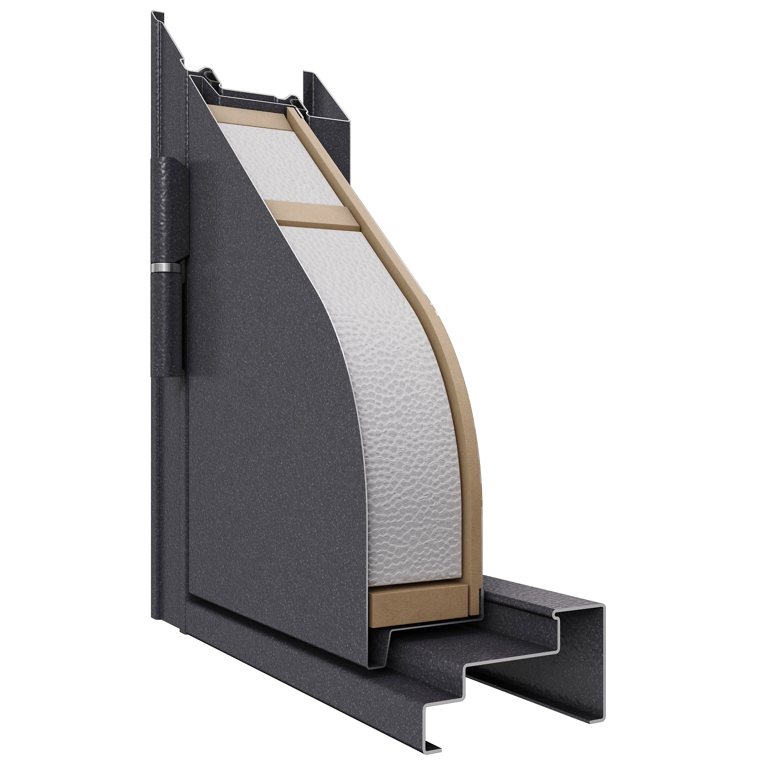 Внешняя сторона обшита металлическим листом 0,8 мм, покрыта антикоррозийным составом и порошковой краской. Внутренняя сторона выполнена из композитных материалов, которые дополнительно увеличивают прочность полотна.