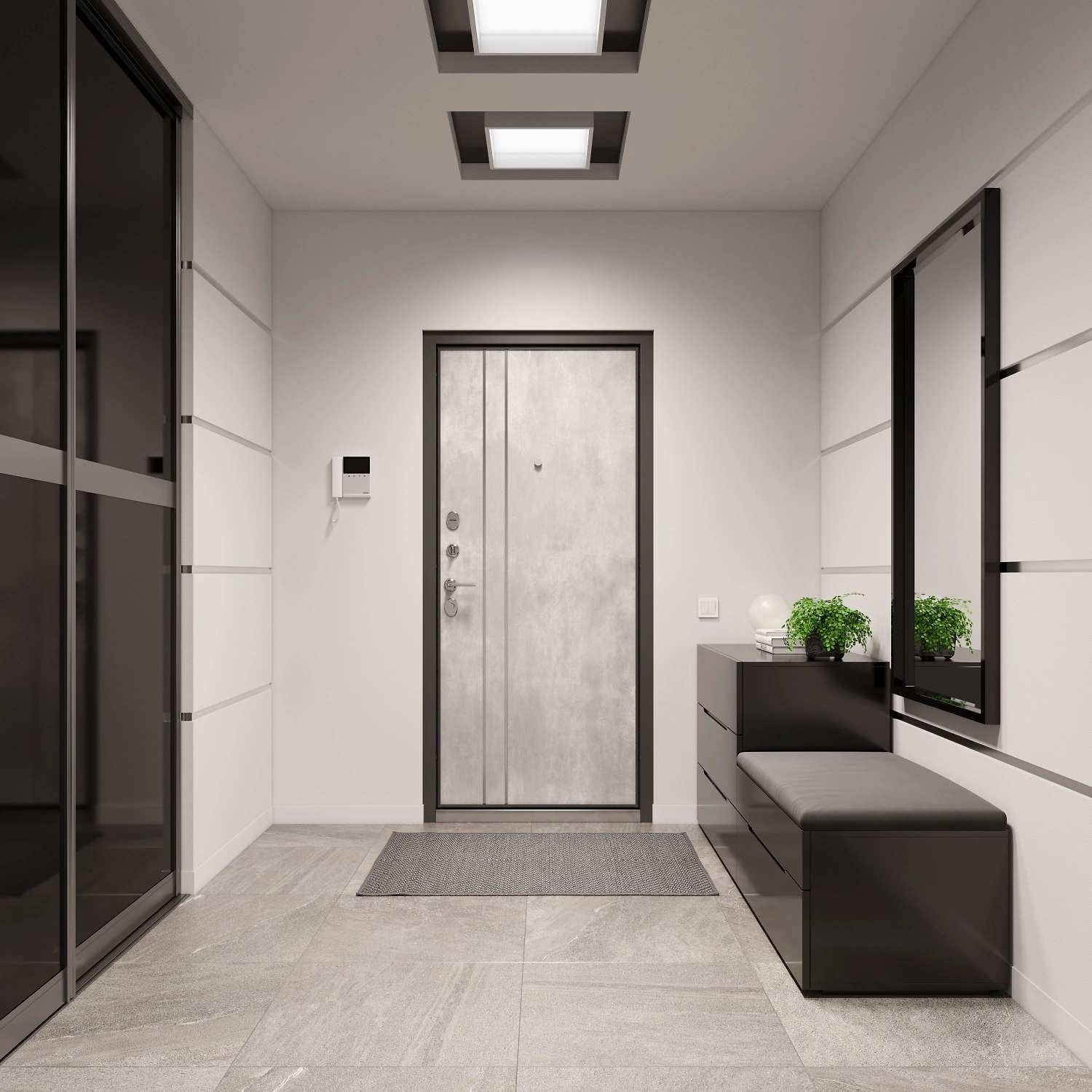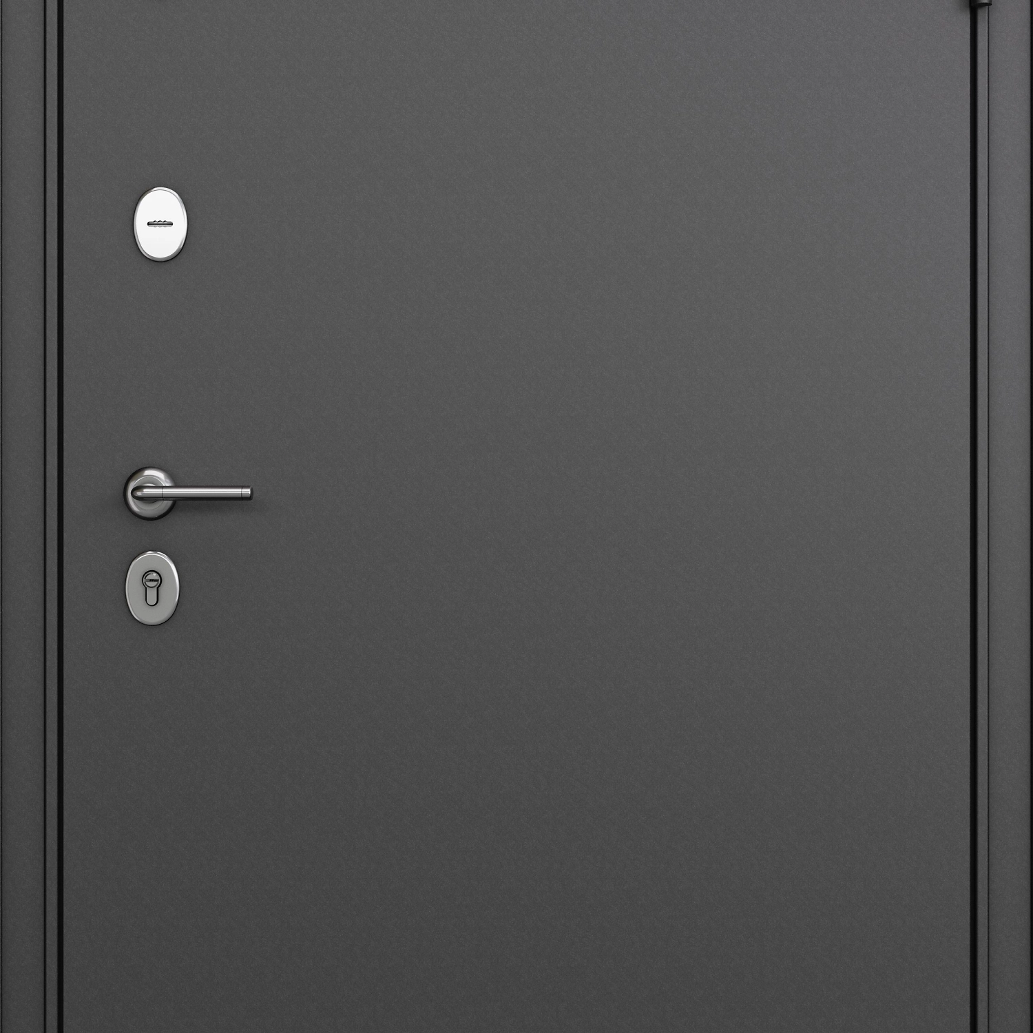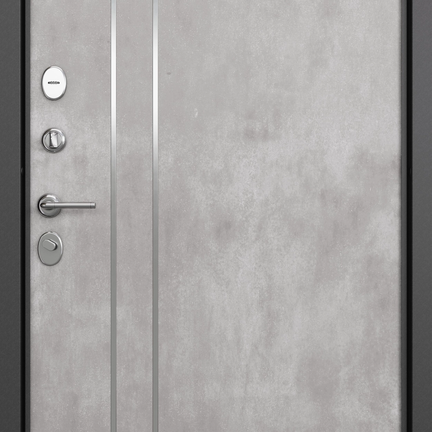 Внешняя отделка двери - металлический лист толщиной 1,2 мм. Декоративное покрытие - МДФ-панель. Входная конструкция имеет цельнокатаный короб с широким наличником и заполнитель в виде минеральной плиты. Снаружи дверь выполнена в цвете “черный шелк”, внутренняя сторона имеет светлое покрытие “под бетон”. Такой дизайн идеально подходит для интерьеров в стиле лофт и минимализм.