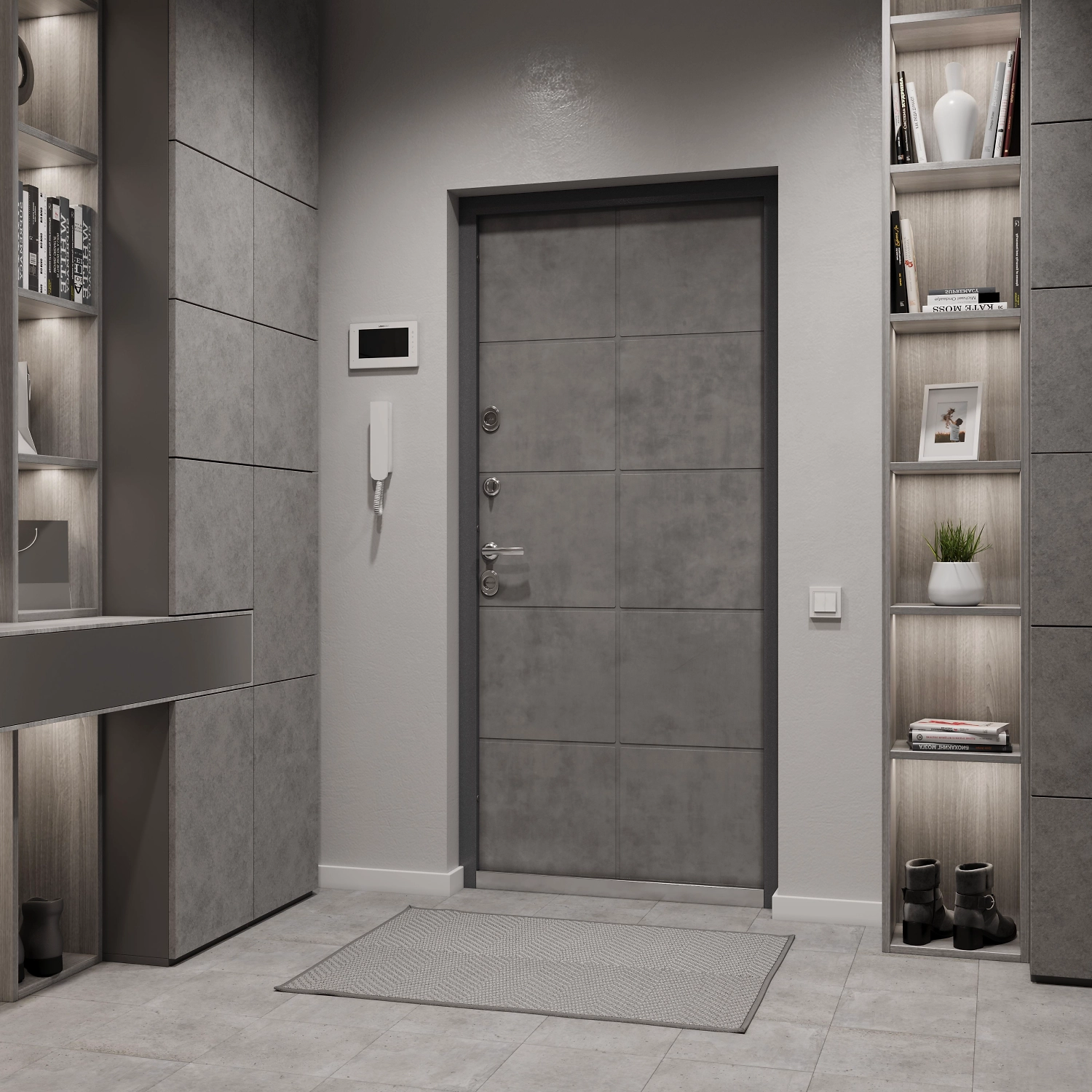 Цвет покрытия гармонично сочетается со многими отделочными материалами для фасада. Дизайн модели – ультрасовременный. Деликатная лаконичная фрезеровка, прекрасно сочетается с трендовым покрытием под бетон. Такие урбанистические покрытия, имитирующие "каменные" фактуры – настоящая страсть самых топовых дизайнеров в последние годы и вы можете применить такой прием у себя.