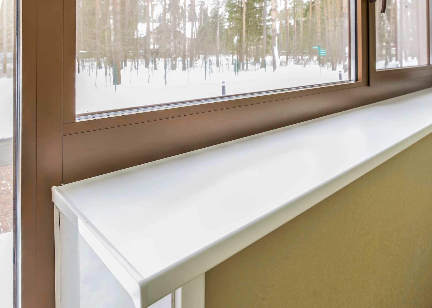 Подоконник из высокопрочного материала LIGNODUR. Основа – смесь ПВХ и древесной муки. Для соединения с декоративным многослойным ламинатом ELESGO-PLUS on top используется полиуретановый клей-расплав KLEIBERIT.
