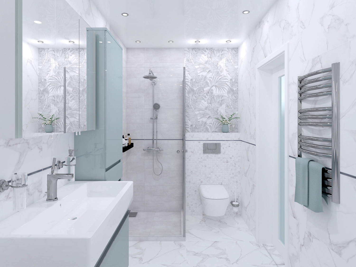 Ещё одним важным элементов дизайна является натуральная мозаика, которая представляет из себя нарезанные на ровные квадраты плиты калакатта и бетона. Натуральная мозаика не теряет свою популярность многие сотни лет и предоставляет неограниченные возможности по декорированию как целых стен, так и выделения определённых зон интерьера.