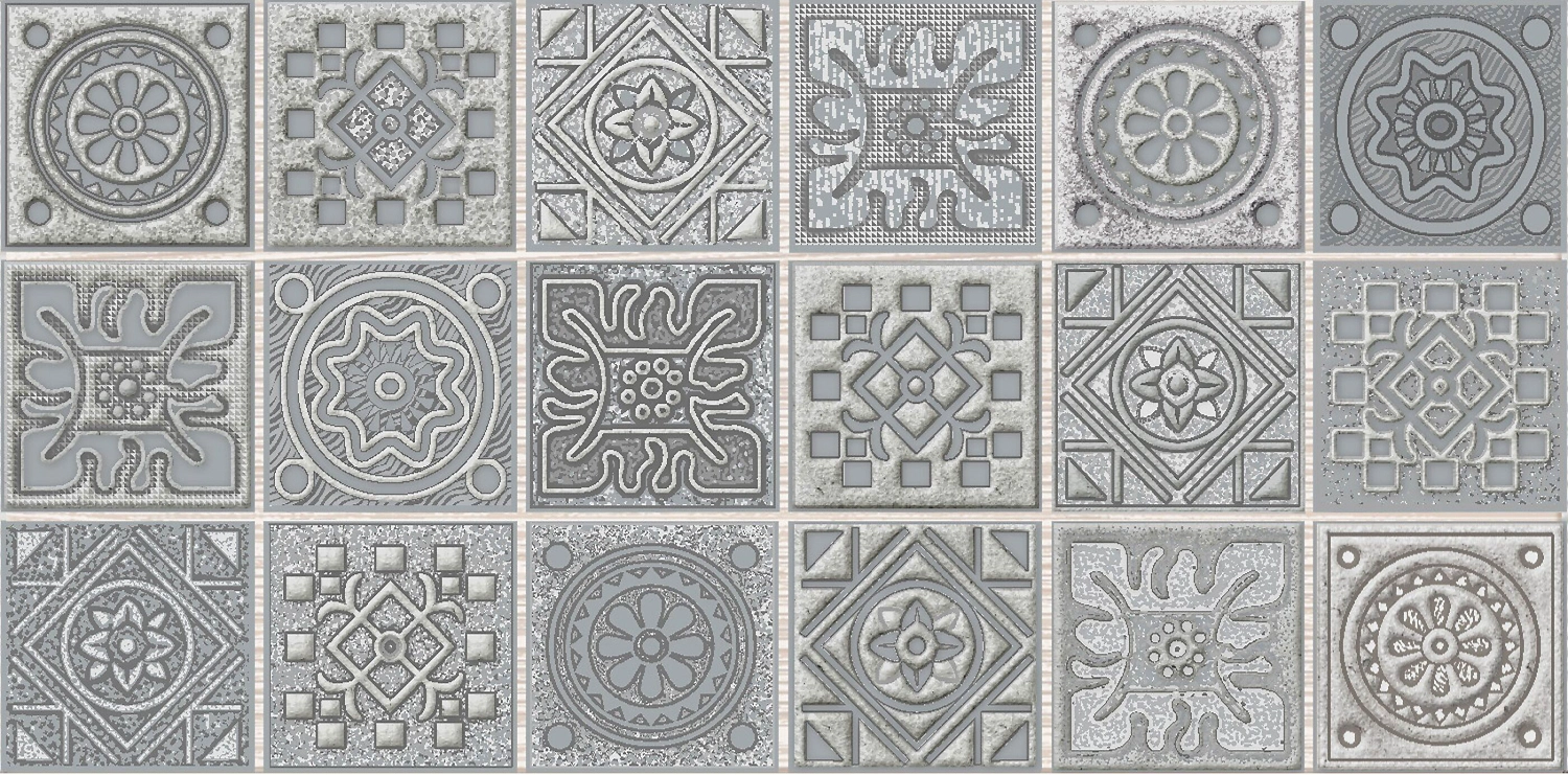 Декор Azori Grazia Grey Nefertiti серый выполнен в виде панно из крупной мозаики с рельефным орнаментом. Плитка имеет матовый фон и глянцевый рисунок, созданный с использованием ветрозы гэлакси.